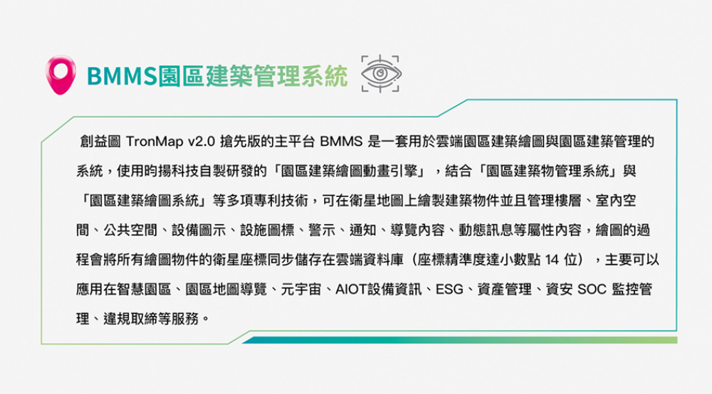 提供高品質動畫繪圖渲染技術,在所見即所得沉浸式元宇宙體驗工作模式下,無需數年,僅需幾天即可完成高品質的工程,只要會打電動不需要會寫程式即可投入建置、維運、管理等工作,大幅度降低導入失敗的風險及門檻。