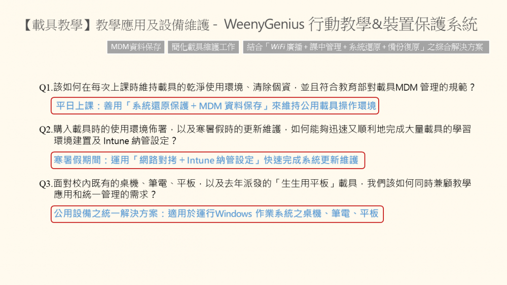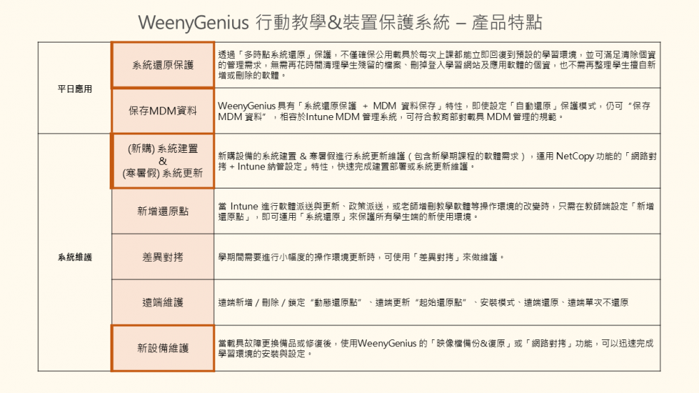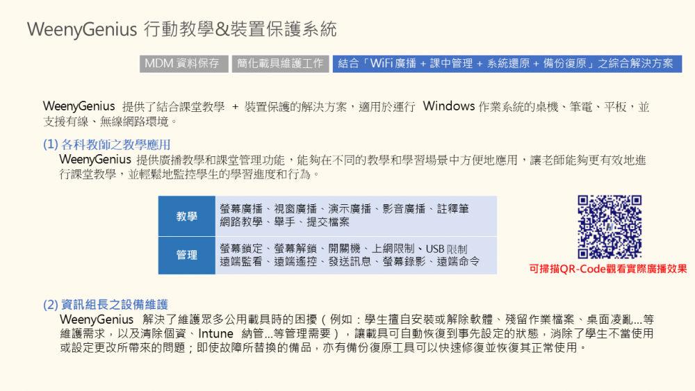 不僅提供“系統還原”和“WiFi廣播教學系統”功能,還符合教育部MDM管理規則。即使載具設置了「自動還原」保護,仍能保存MDM資料,確保安全與隱私,讓載具維護人員能安心使用「系統還原」來快速恢復環境。「系統還原 + MDM資料」同時滿足課堂教學及主管機關需求,簡化維護和管理