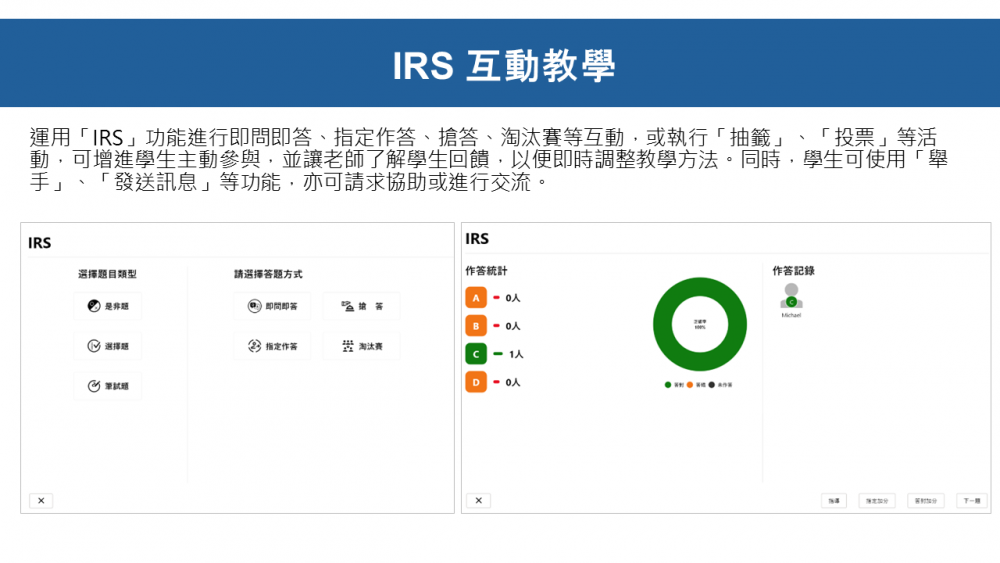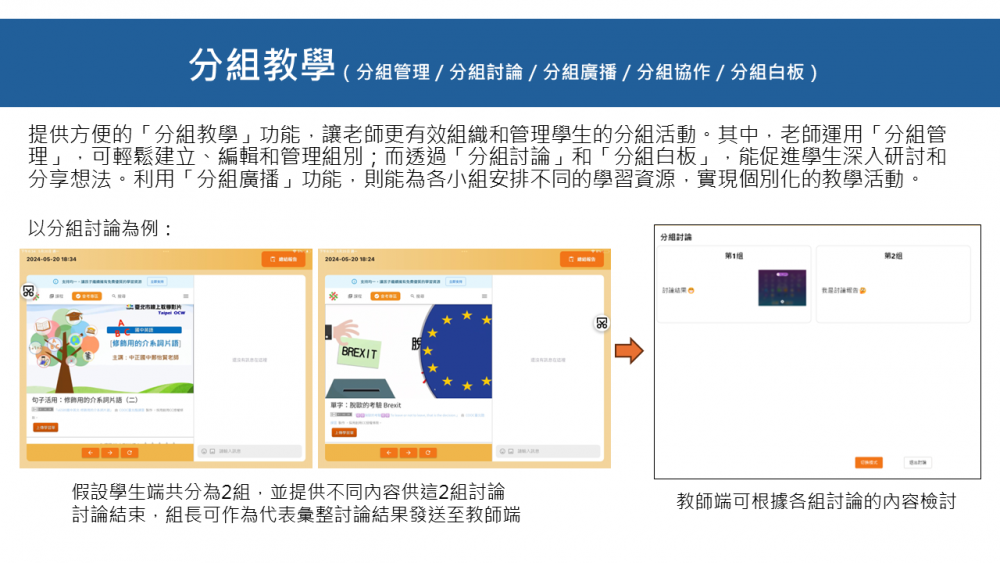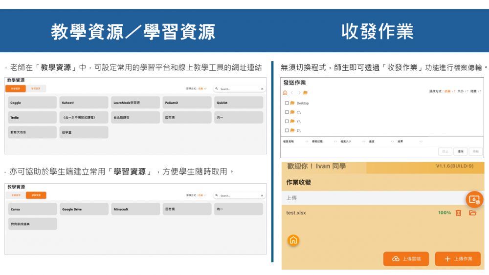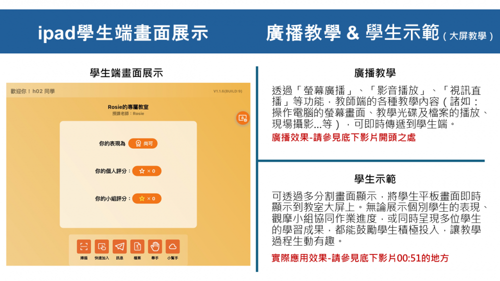 TeenyHopper 提供多項便利功能,透過網路傳輸,讓老師輕鬆進行「大屏教學」,運用大屏分割顯示,展示學生學習成果及分組協作進度,鼓勵積極參與。同時支援互動教學/分組教學/廣播教學等活動,具備 IRS、抽籤、投票、分組討論、分組白板、分組廣播、螢幕廣播、影音播放、語音廣播、視訊直播、作業收發、網路教學、螢幕鎖定、共享白板等功能,方便師生使用雲端教學資源和線上學習工具,將數位教學融入傳統課堂。