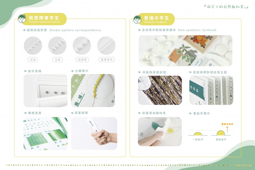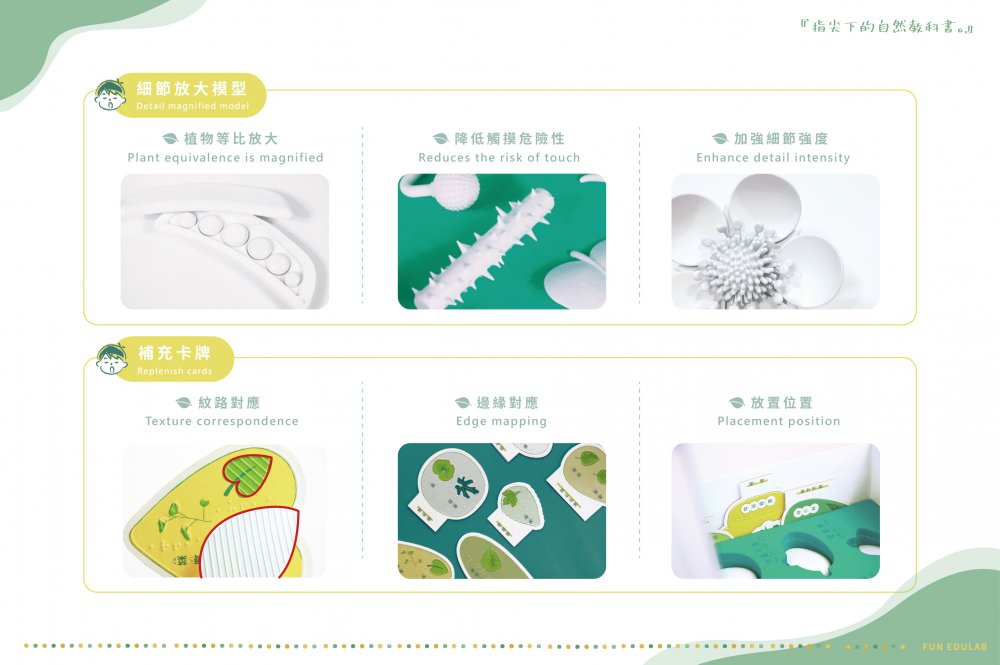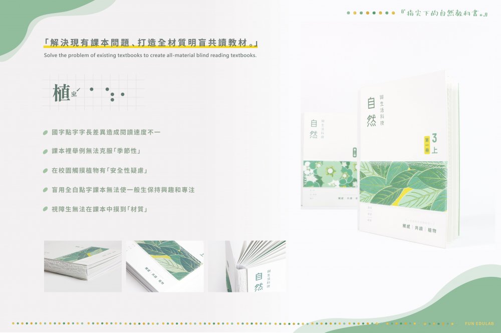 對於視障學生,在特殊教育法推廣融合教育後,雖然視障教具增加,但大部分科學教具還是無法解決視障學童缺乏視覺經驗認知,進而產生的學習遲緩的問題。而對於一般學生,在國小三年級才第一次接觸到自然科學,其中的科學抽象概念及專有名詞時常讓學童在學習上倍感挫折。結合上述問題,現今許多視障融合教具便在重視實用的前提下,犧牲了圖像認知。因此本團隊從現有課綱切入,秉持『啟動默克細胞』的理念,藉由全材質應用發揮觸感學習的最高價值,將觸感和科學教育相互交融,打造出明盲共讀的美感圖像認知教材—『植感學』。
