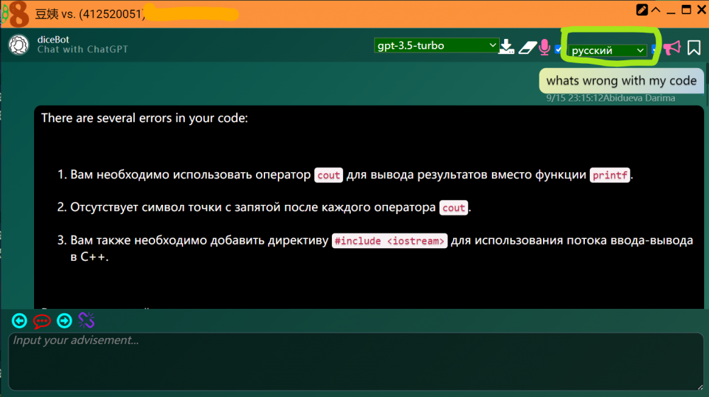 在一個程式設計課中,多數的學生是來自台灣的學生,少數來自不同的國家,案例中有來自俄羅斯與印尼的學生;這兩位學生在學習程式語言的同時多了一份來自語言的障礙,豆姨助教精通各種語言,兩位學生可以不用他們不會中文與不精通與英語來與豆姨對話,而是可以使用她們自己國家的母語來學習程式設計。