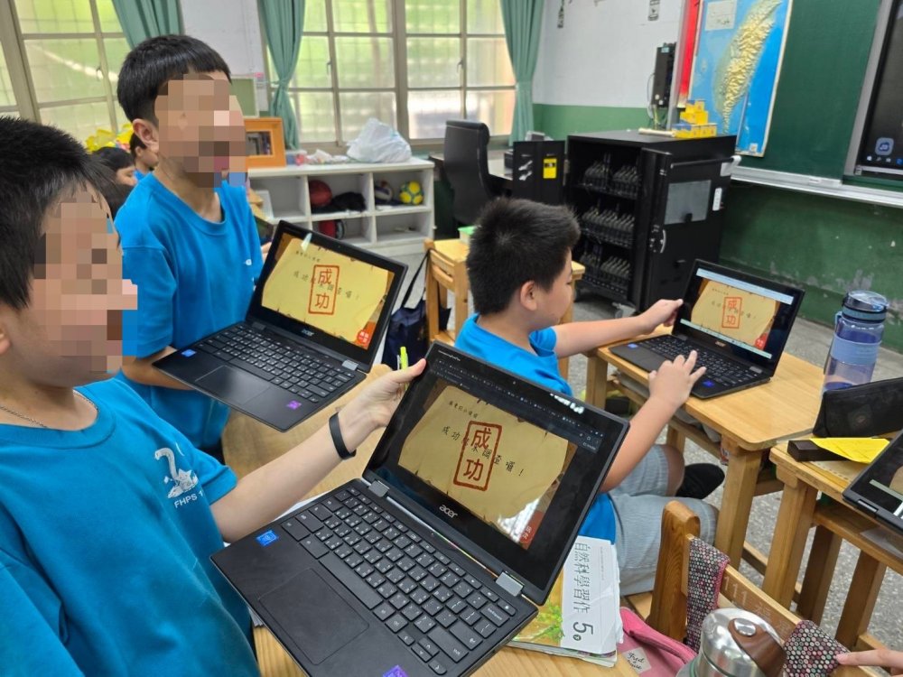 於大觸屏簡單進行操作講解,透過classroom派發連結給學生,學生開始進行互動遊戲,過程中學生自發互相討論,先破關的學生也會將成功經驗分享給朋友,結合了數學與班級經營