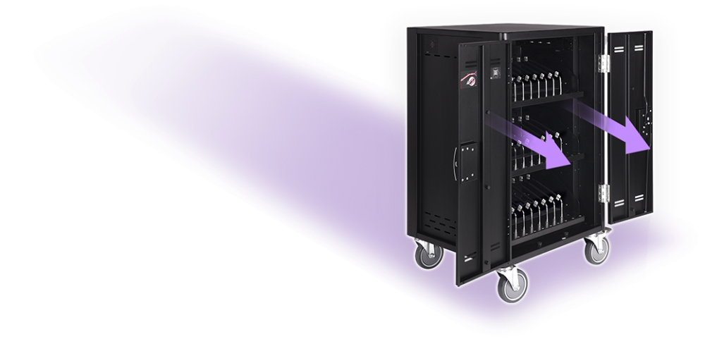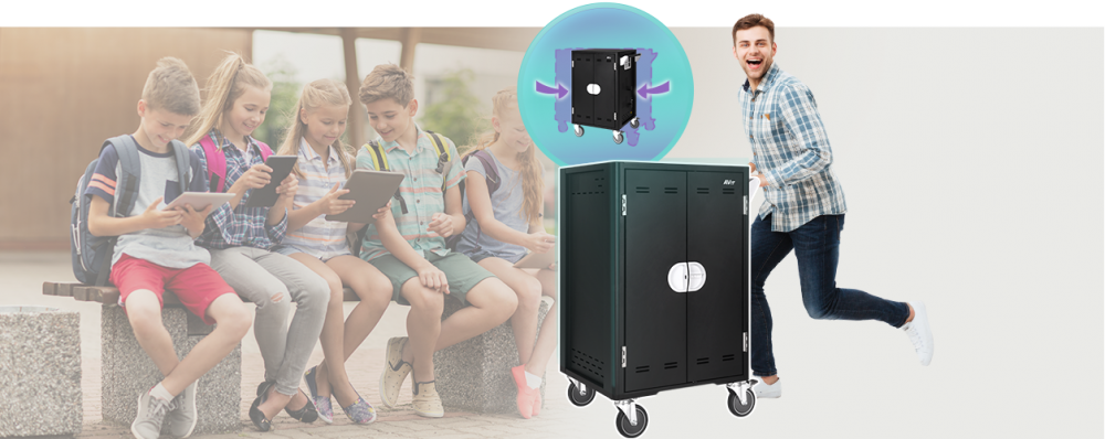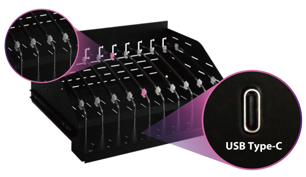C30u+ 充電同步車擁有不佔地的外型,特別適合空間節約的教室規劃。配備 30 組獨立的 USB Type-C 插槽,可儲存、充電和同步多達 30 台 iPad®、AndroidTM、Windows® 或 ChromebookTM 平板電腦。三層式活動式托盤設計,讓學生取放平板更快更便利。C30u+ 以安全為第一考量,機身配置雙風扇,幫助充電時有效散熱;三點式安全鎖的前後門和可上鎖腳輪,防竊盜也防傾倒。有了 C30u+ 做最佳後衛,充分滿足老師隨時隨地行動教學的機動性。