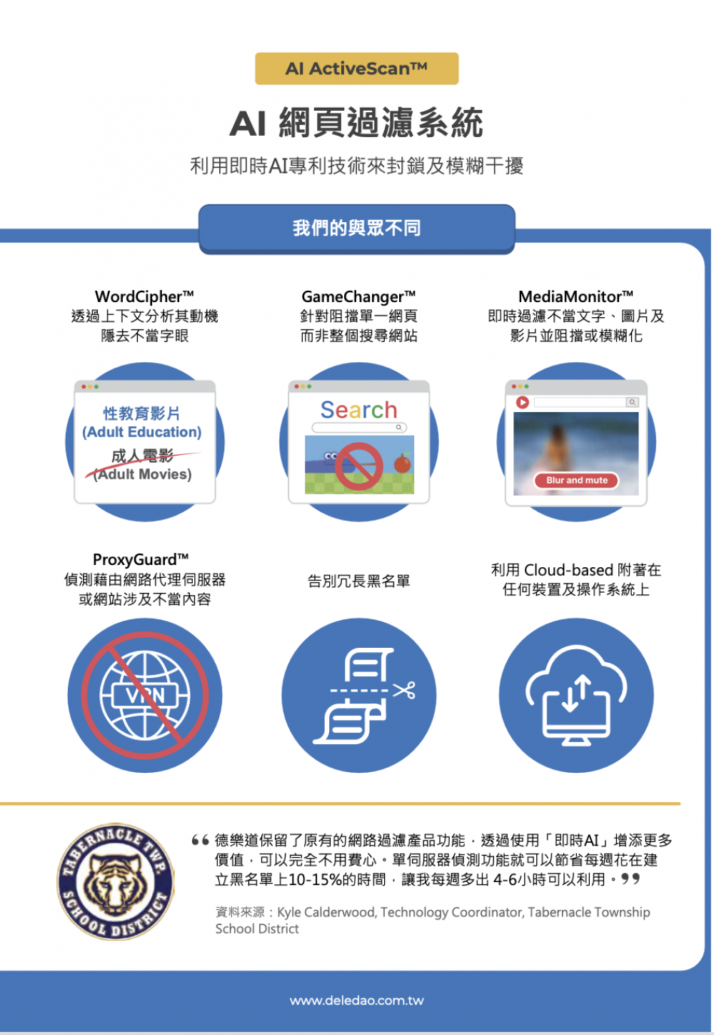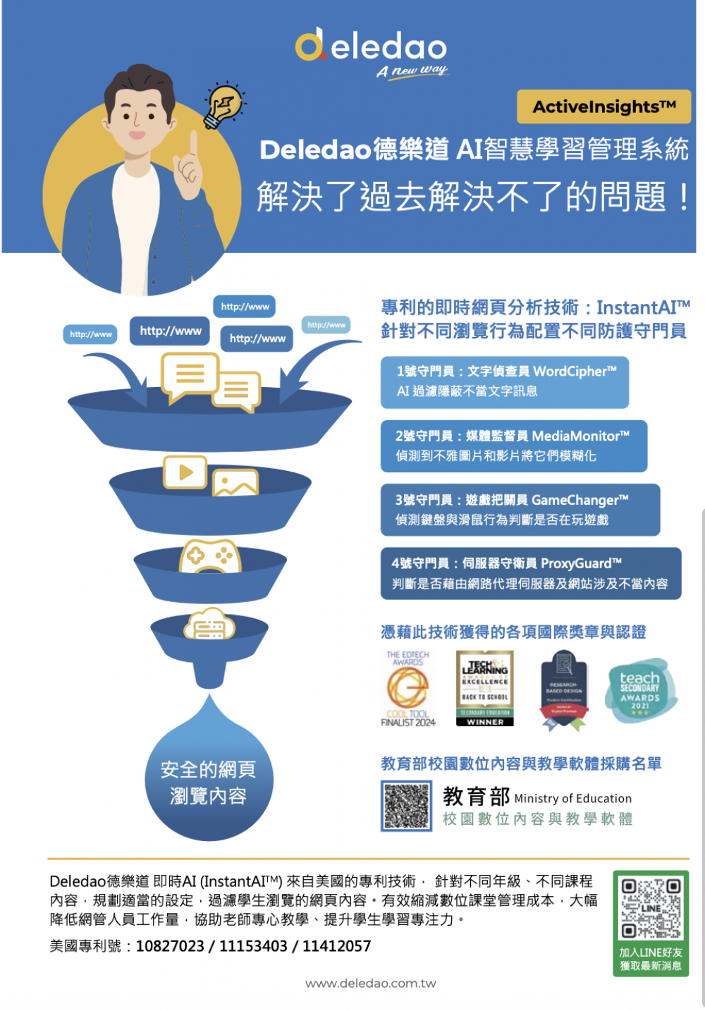 Deledao德樂道 在矽谷研發出獲得美國專利的人工智慧 InstantAI™技術(即時AI),模擬真人思考途徑過濾互聯網上各種不當內容,阻絕學生面對各種網路干擾、誘惑與不當內容,專心於數位學習。