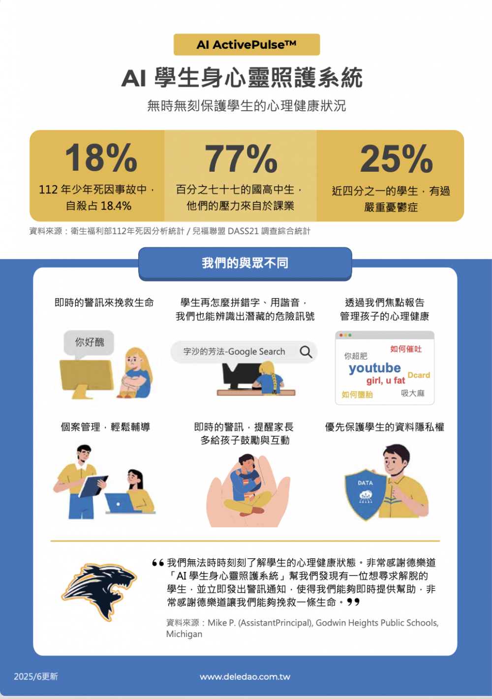 • AI 學生身心靈照護系統,即時發現學生身心靈問題,一旦出現自殺、自殘、網路霸凌等端倪,能即時通報老師、家長、網管人員,並提供學生完整上網紀錄協助處理,避免發生憾事。