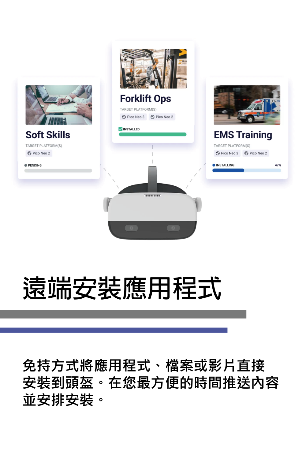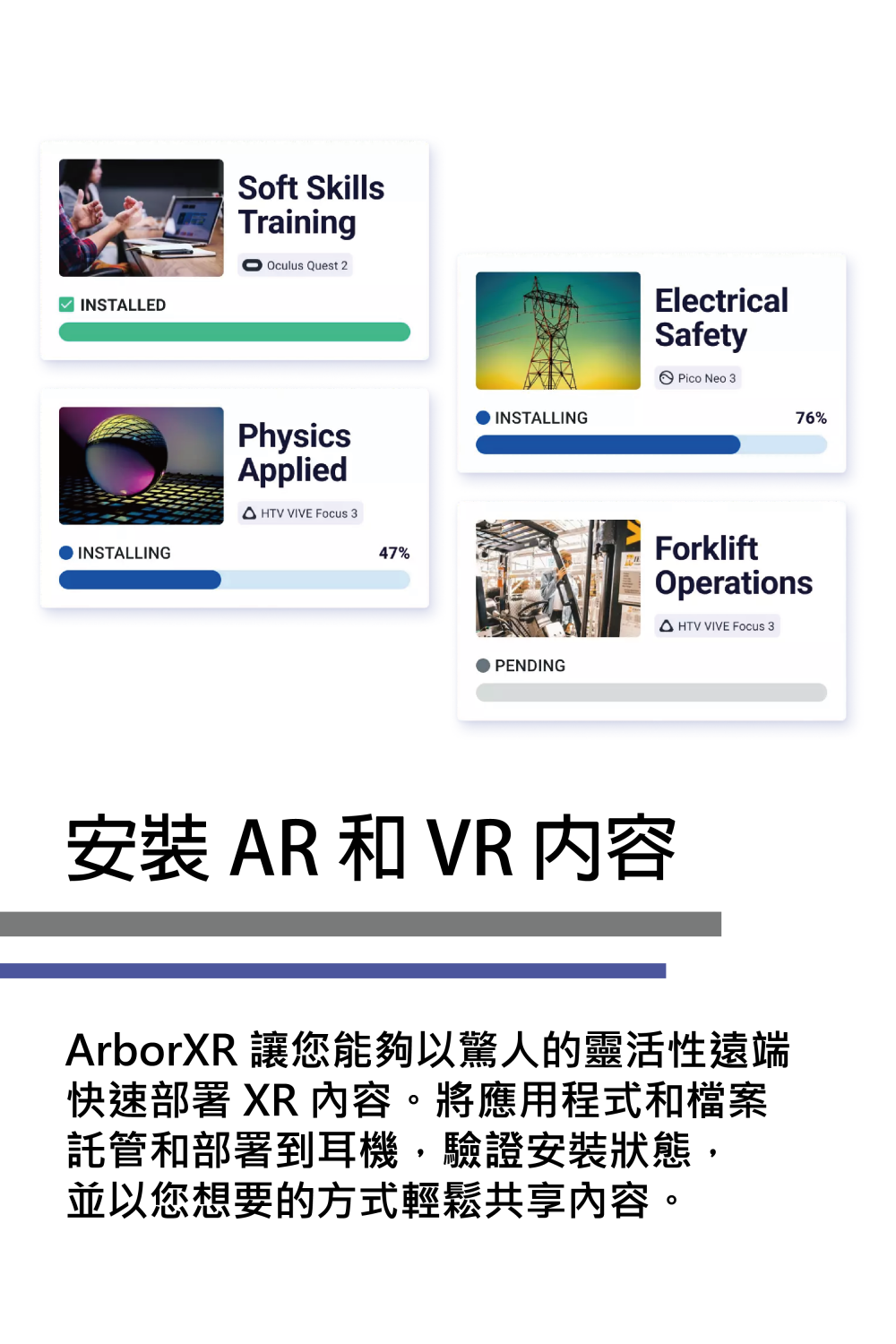 透過ArborXR,管理者或教師可以遠端管理和監控多種廠牌的XR設備,並在保障資訊安全的同時,也能夠輕鬆地安裝和部署教育相關的XR內容。