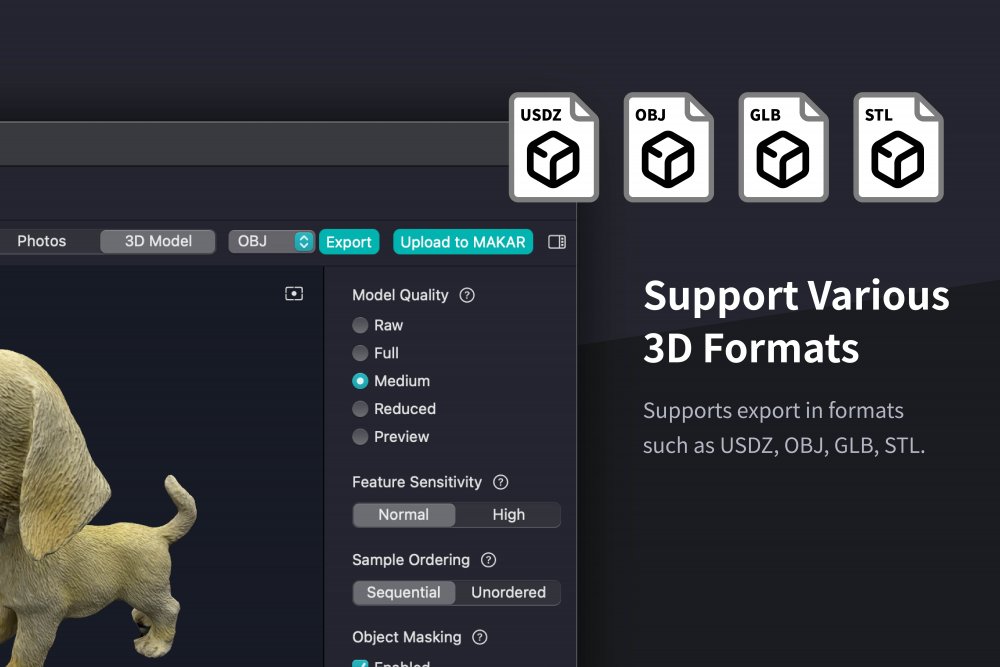 APP支援USDZ、OBJ、GLB、STL等多種格式輸出,與MAKAR連動,所掃描的3D模型將自動匯入MAKAR素材庫,快速展開XR 編輯。