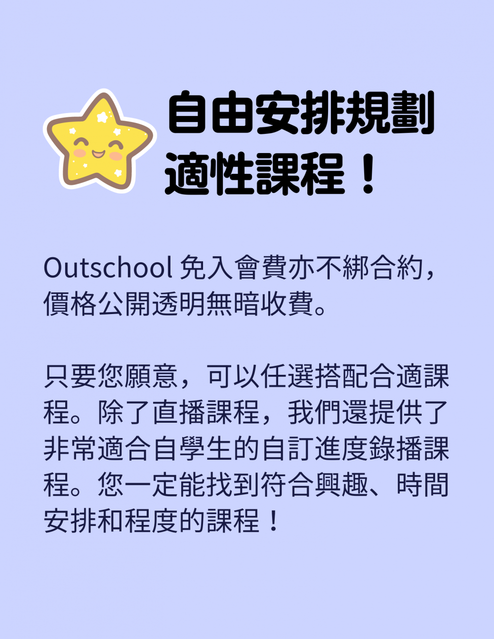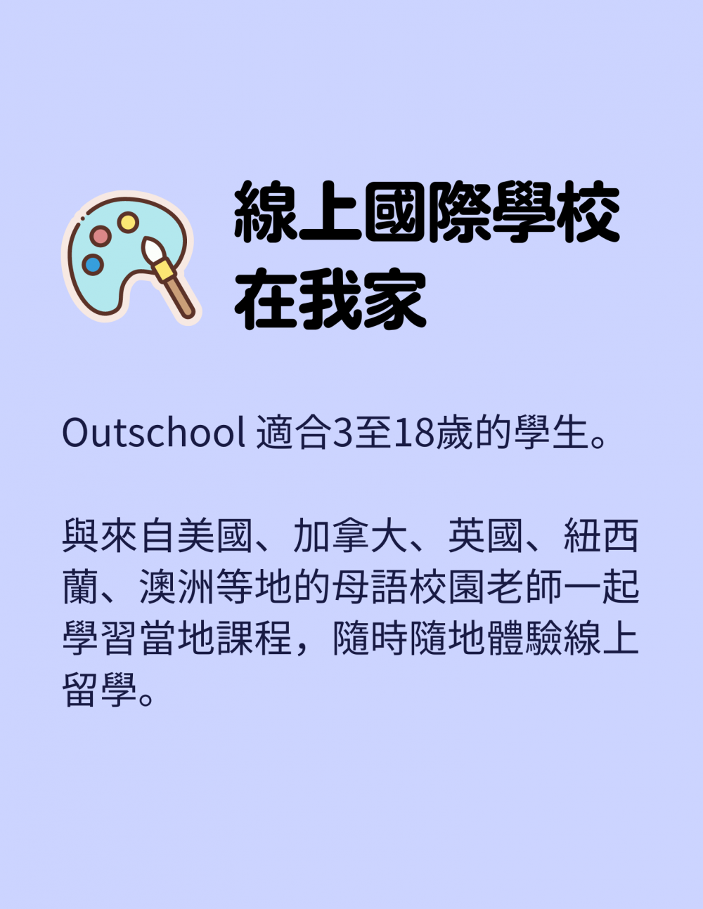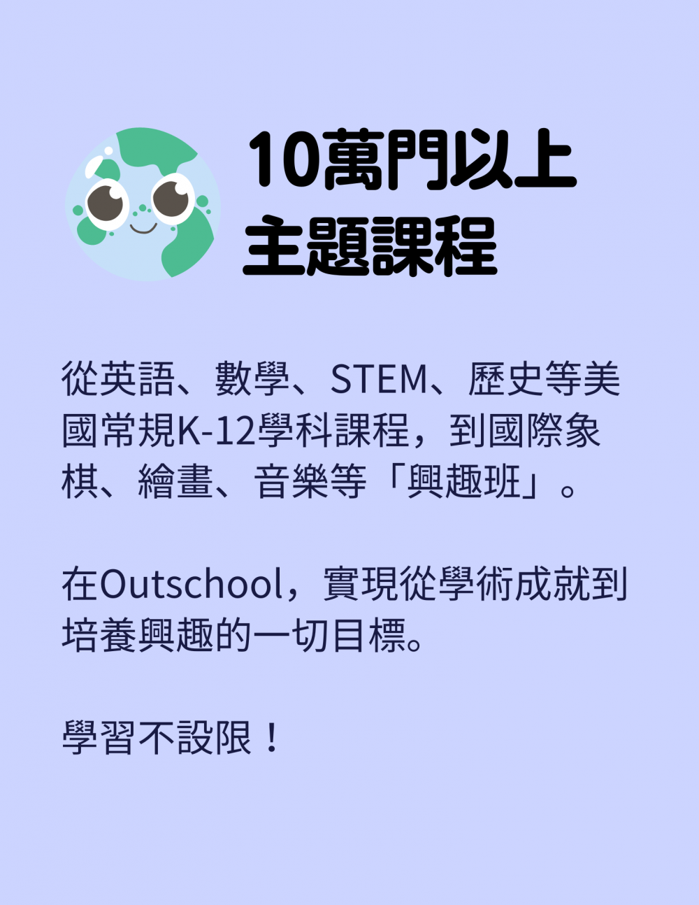 總部位於美國舊金山,是美國最大的線上學習平台,也是在家自學的首選教育平台,專為3-18歲的學生設計,透過各種主題、專業教師設計的課程,按照自己的方式學習,滿足孩子的興趣,且激發孩子對學習的熱忱。我們提供多種教學形式,包括一對一家教(One on one) 、有趣且互動多的小班制直播課程 (live online meeting)、可以隨時參加的彈性預錄課程(flex),以及主題式月費制的學生社團(groups),由一位專業的老師帶領,集結來自世界各地的學生,一起圍繞著感興趣的主題,共同研究及討論。Outschool是由前谷歌(Google)和Airbnb員工於2015年共同在矽谷創辦的線上教育平台,被全球最大的教育科技調研機構Holon IQ評選為2022,2023年教育科技的獨角獸公司。 亦被Fast Campus選為2021年最具創新力的公司。目前,全世界有200個國家/地區,超過100萬名兒童學習者均加入了Outschool快樂學習中。