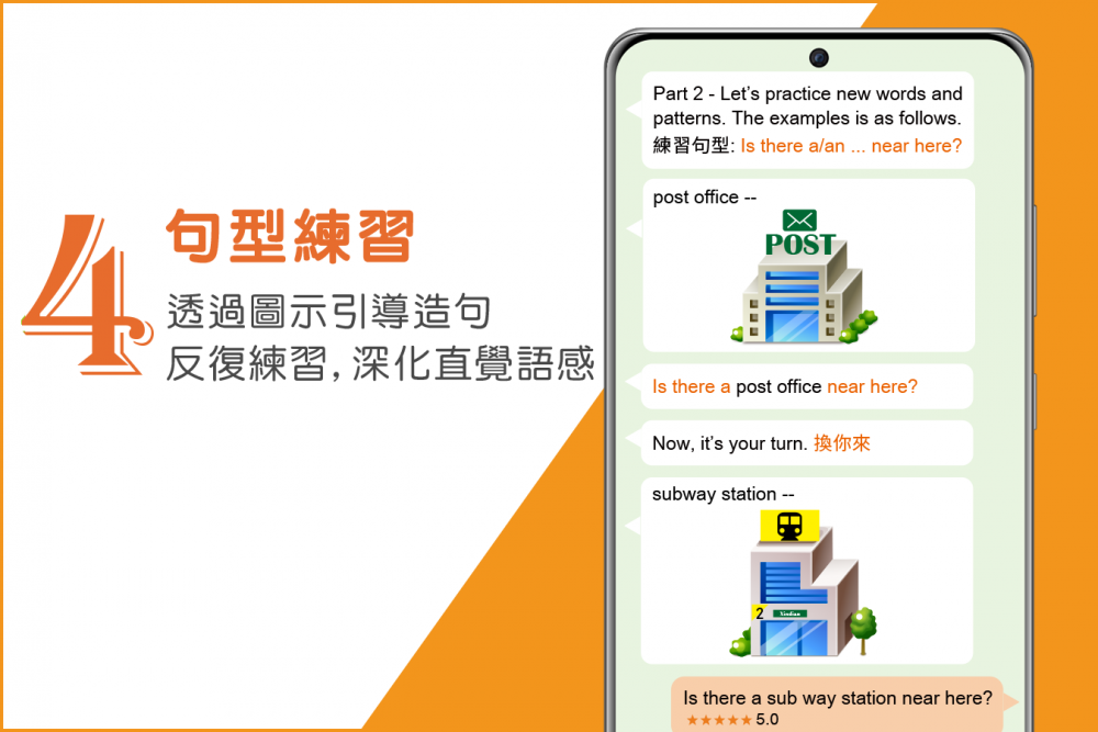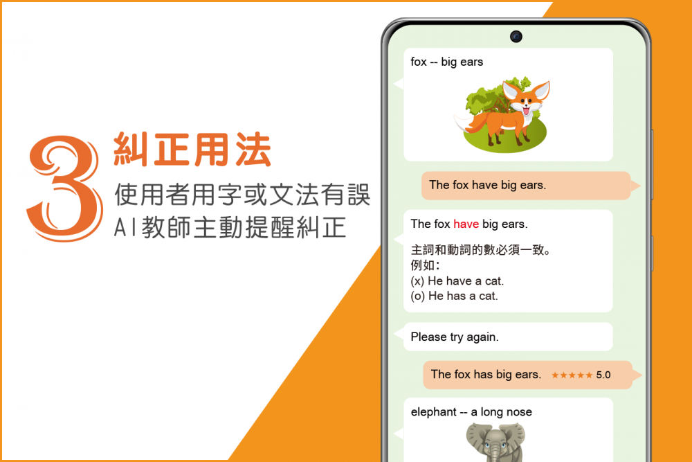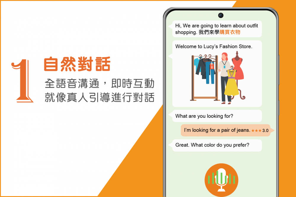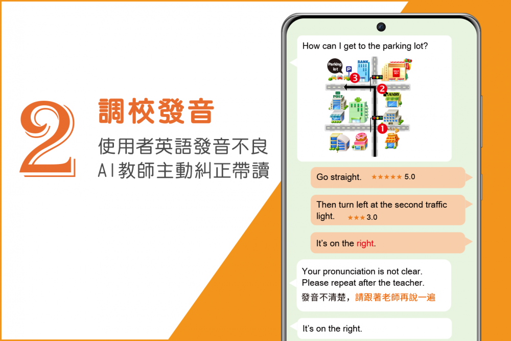 這是一套包含豐富課程內容的應用,以語音互動方式引導不同程度的使用者練習英語口說。練習方式就像和外語教師一對一交談,佐以有趣的圖片和鼓勵回饋,讓使用者在互動中聆聽對話、跟讀句子、練習造句、應用對話,完整練習後達至敢開口、習慣聽說英文。其間 AI 老師會糾正使用者的不良發音和用法錯誤,有效提高使用者的英語能力。