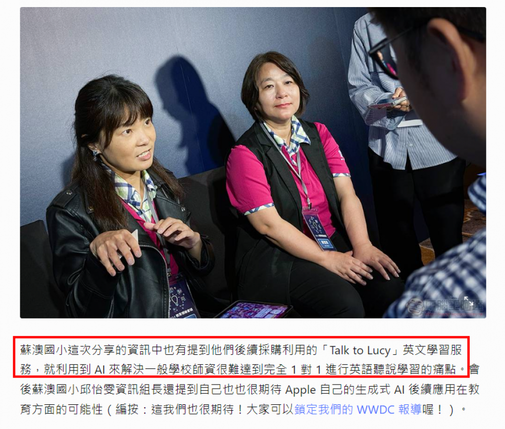 113年蘇澳國小榮獲「教育部數位學習績優學校-特優獎」(全國只有2所獲獎學校),在記者會中邱怡雯組長特別指出採用 Talk to Lucy 學習服務,就是利用到 AI來解決一般學校師資很難達到完全一對一英語聽說學習的痛點。