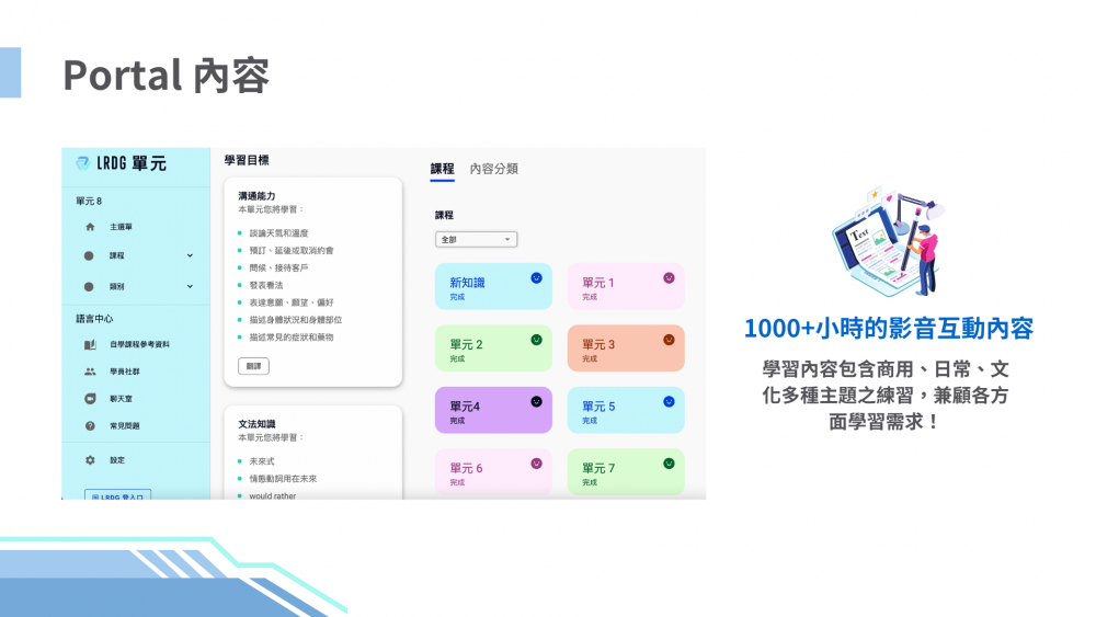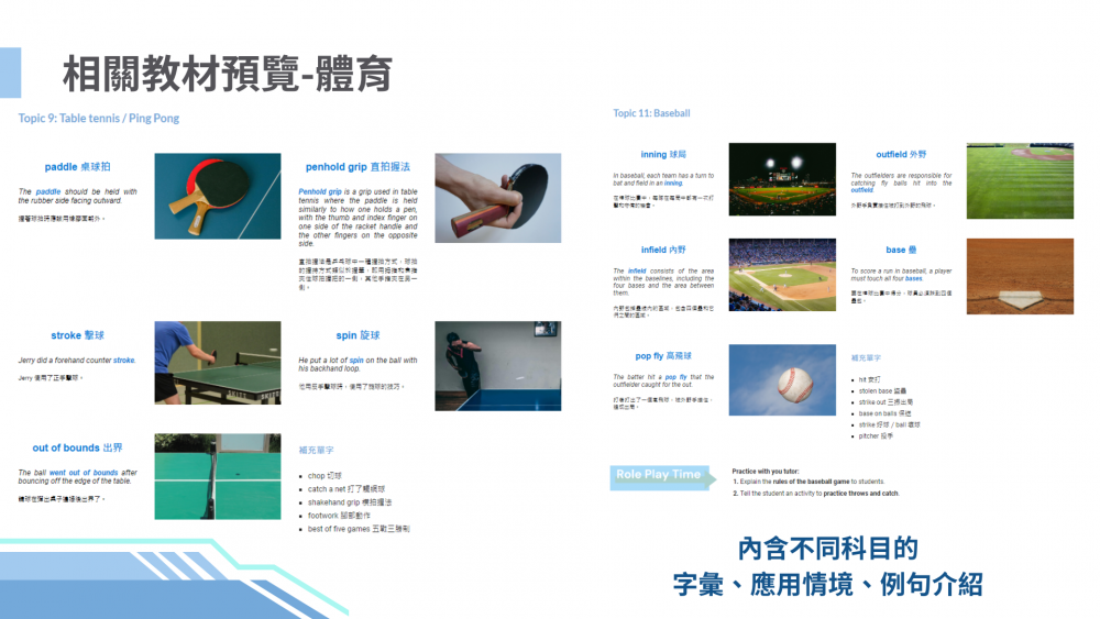 本課程針對部分領域雙語科目,設計對應學習教材、課室英文、口說課程練習題目,幫助雙語教師藉由口說課精進英文能力、預先與 LRDG 家教老師練習與模擬實際雙語教學情境,減輕雙語教學備課壓力與時間,提升備課成效,建立教師們的英文口說自信。