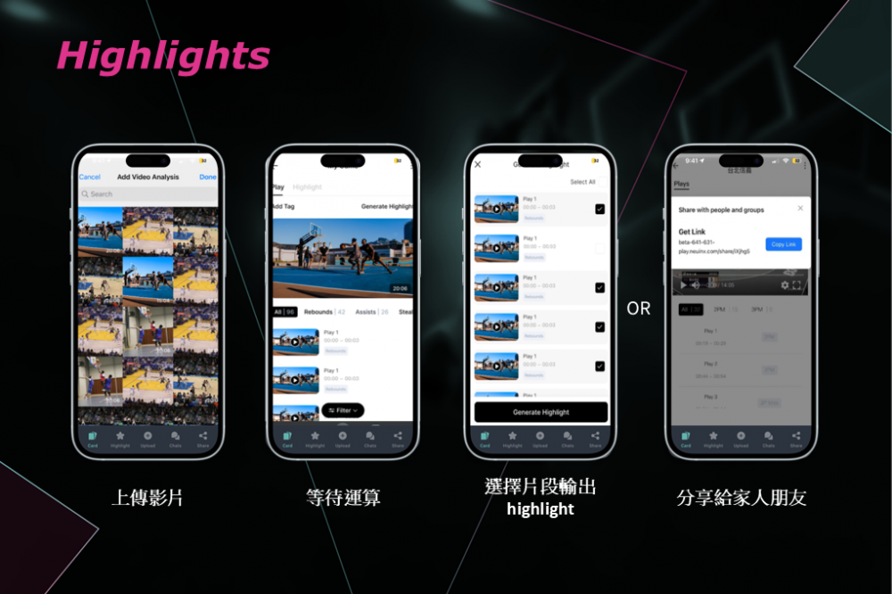 紐因科技運用AI影像分析技術,為籃球愛好者與家長們開發了一款創新的SaaS平台。用戶只需將籃球比賽影片上傳或錄製至平台,系統會即時分析並提取出每次出手的關鍵資訊,包括球員的出手位置、時間、方式和進球情況,無需手動標註。此外,平台還能自動捕捉精彩片段,供用戶選擇整合成完整影片並分享,省去繁瑣的剪輯時間,不再占用下班後的空閒時間,輕鬆取得比賽的精華片段。