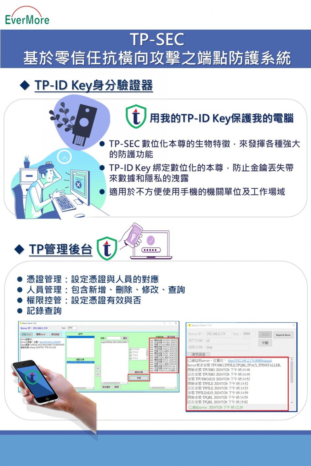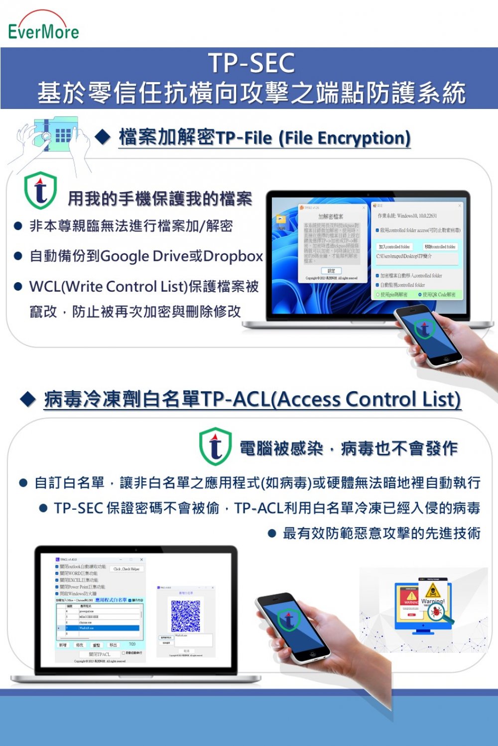 本系統導入零信任架構用以保護個人電腦上重要的資料與防止惡意軟體的不當執行,採取資安聯防,為個人電腦高築橫向攻擊的銅牆鐵壁,具備微分割的零死角防禦功能。