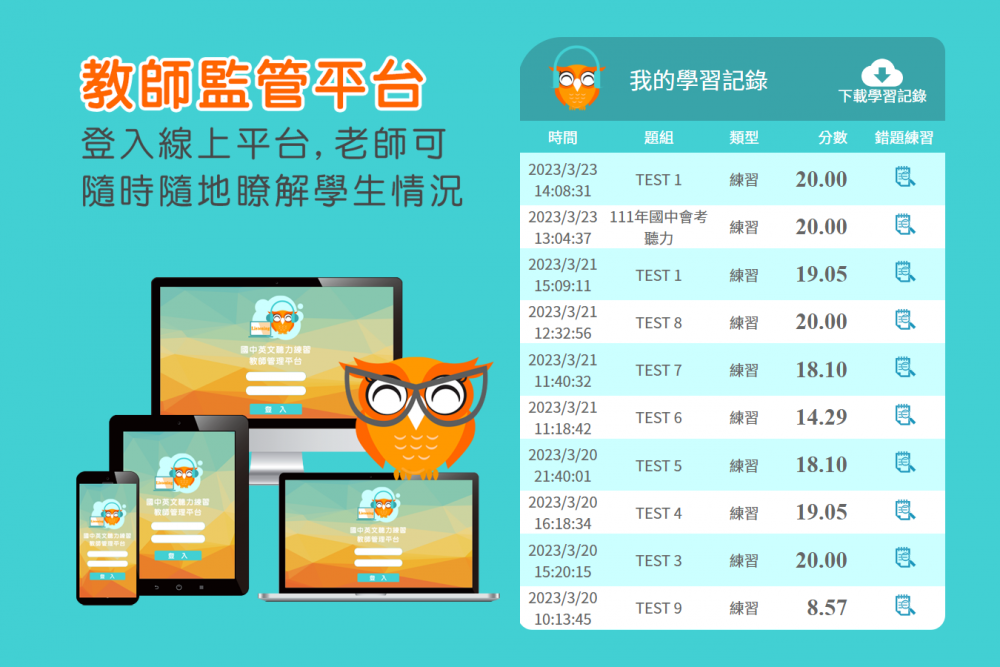 本系統可在課堂上使用,也可由老師佈置作業讓學生在家練習。老師在瀏覽器登入教師管理端,可以監看學生的學習情況和完成度,亦可下載學生的使用記錄作為學習歷程佐證。