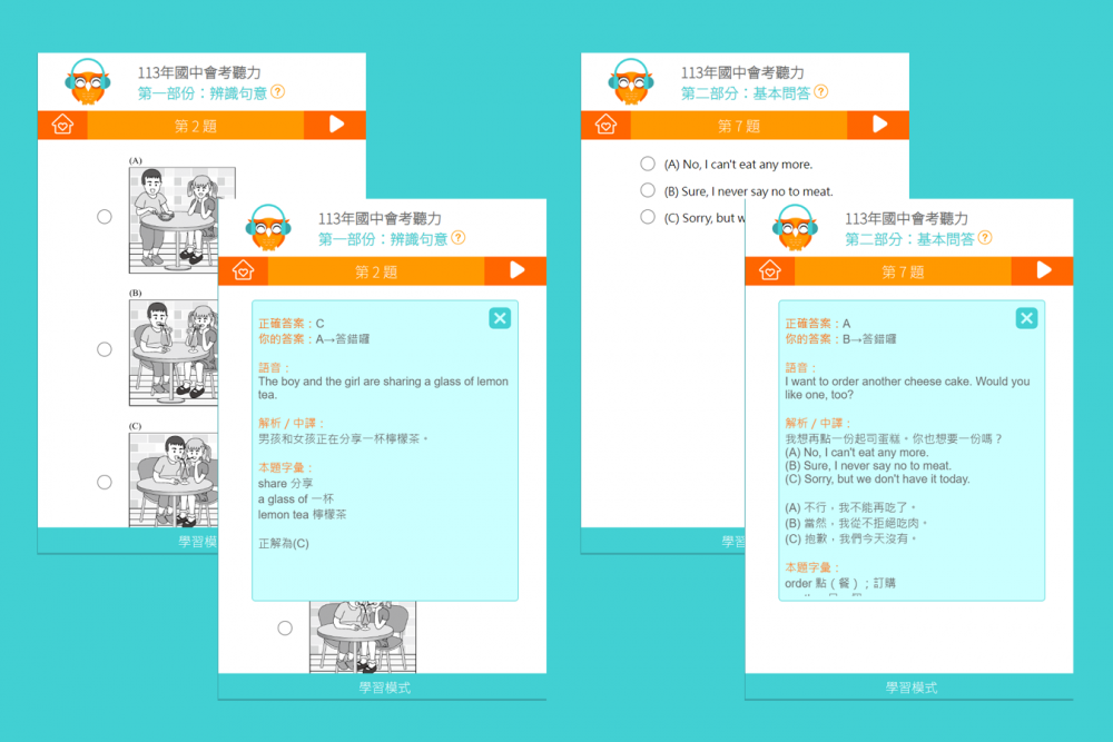 【國中英文聽力練習系統】是一套免安裝,由瀏覽器登入即可使用的線上應用。針對國中學生及同等程度的使用者設計,旨在提升其英文聽力以及應考實力。除了提供多元擬真的聽力題庫之外,透過學習系統的雙學習模式、智慧出題、精闢解析、自動生成錯題補強等功能,使用者能迅速有效地強化英文聽力,同時熟悉實況應考節奏,考出聽力好成績。