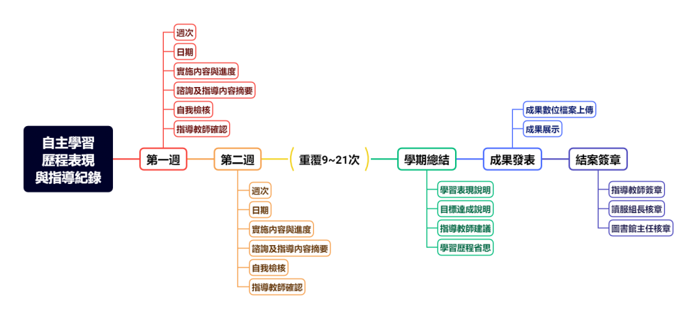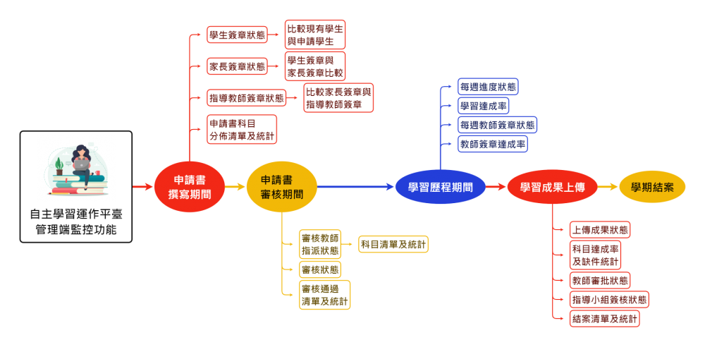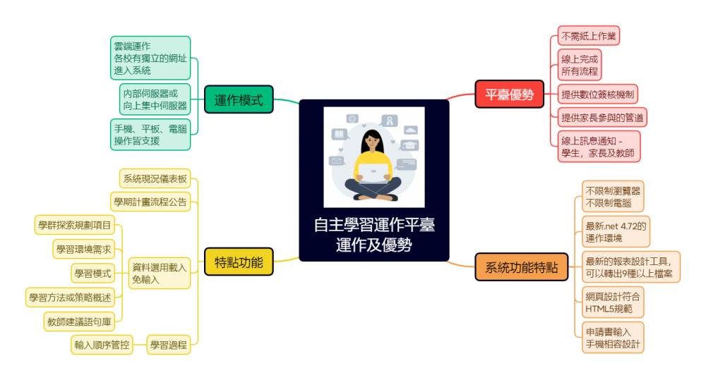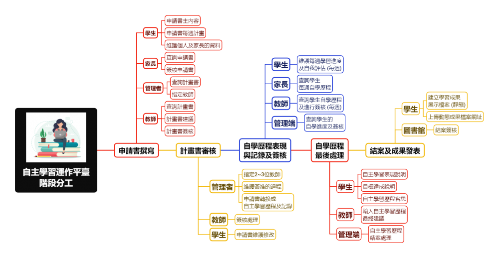 自主學習運作平臺支援雲端線上使用,並提供學生填寫「自主學習計畫申請書」,提供指導教師進行指導及線上審查,初審後提交審查教師們進行複審。複審完成即可進行每週學習歷程的登錄,指導教師依每週的進度進行建議、評估及指導。直至計畫完成時,學生可以提交成果報告,再由審查小組審核是否通過。待通過後即可完成該學生的自主學習課程。