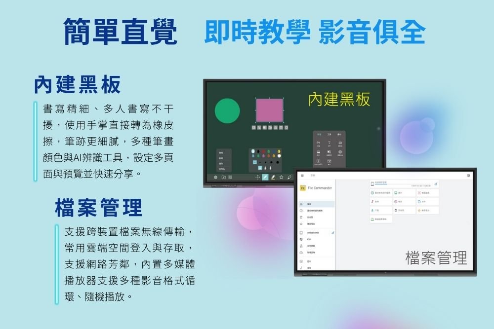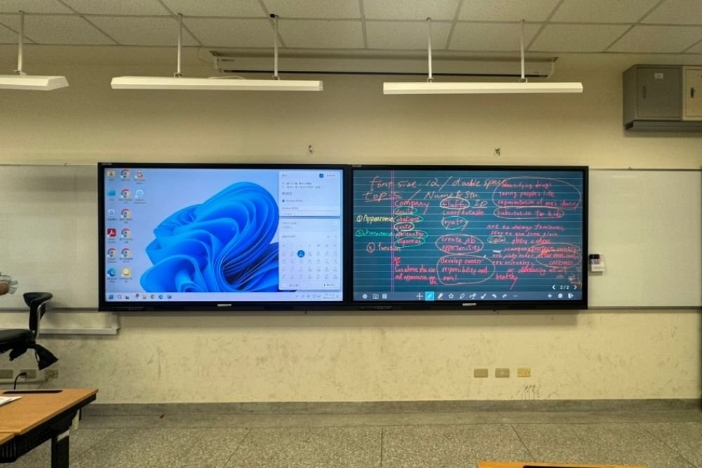 讓觸控大屏可以更多樣化的功能使用,例如一邊採用簡報投影片教學,另一台可以開啟大屏的白板app進行註記操作,或是延伸桌面的顯示可以一台呈現視訊畫面一台呈現教學畫面,讓操作空間有更靈活的運用
