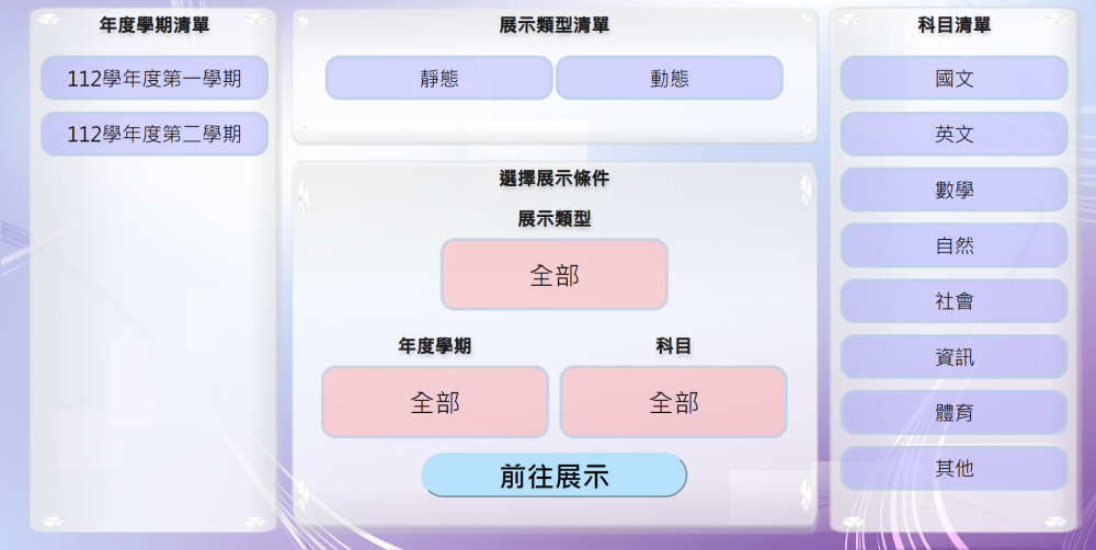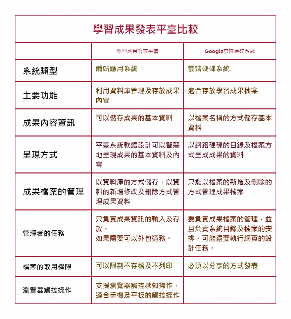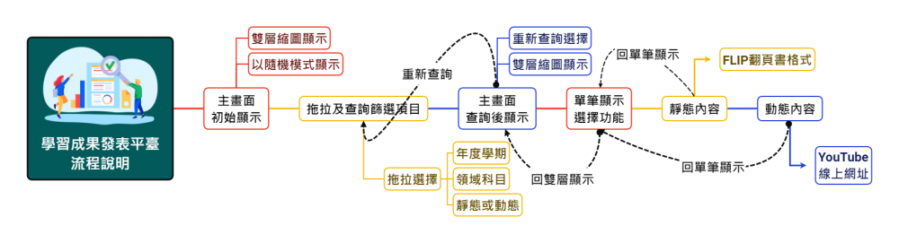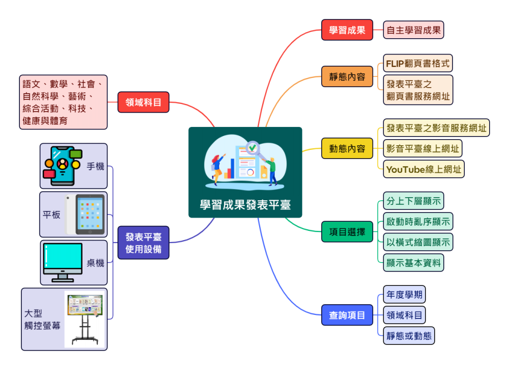 成果發表平臺係利用線上功能讓學生能夠自行發布學習成果之電子檔案,諸如:簡報檔、電子檔、電子書格式檔、PDF或影片檔,並且能在系統中隨機撥放學生已發布之成果電子檔案,在學校內進行學習成果的組織及存檔,讓學生能透過此系統,與他人進行分享及交流活動。學生能藉由這類的分享交流活動,建立自主學習多樣學習模型,擴大同儕自主學習的視野,並增加學生學習的高度。教師在課堂上使用本系統,亦能增加課堂豐富度及趣味性,有趣的互動模式能帶動學生學習興趣,提高自主學習意願。