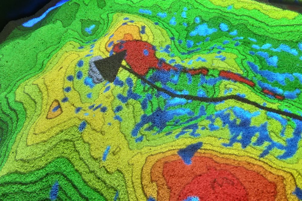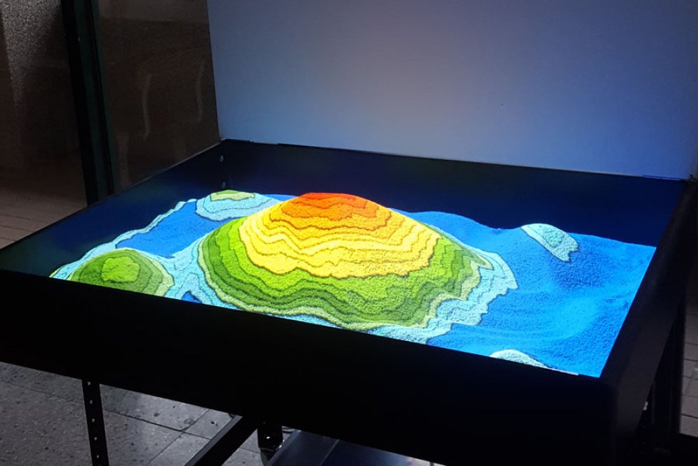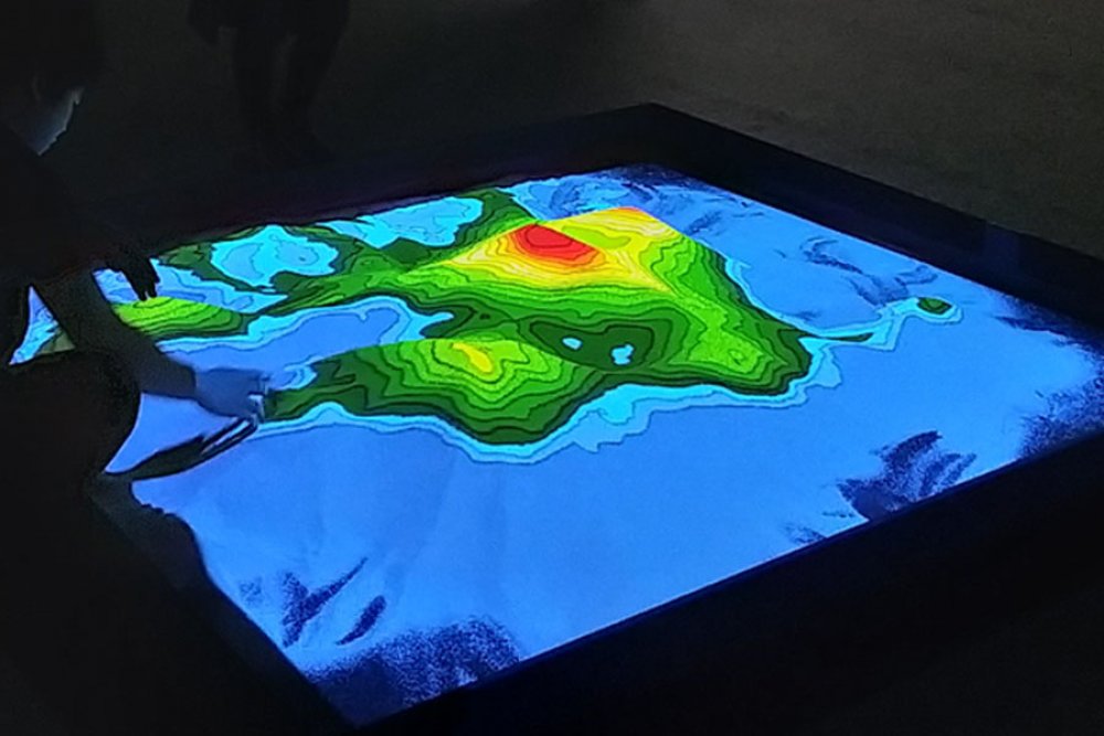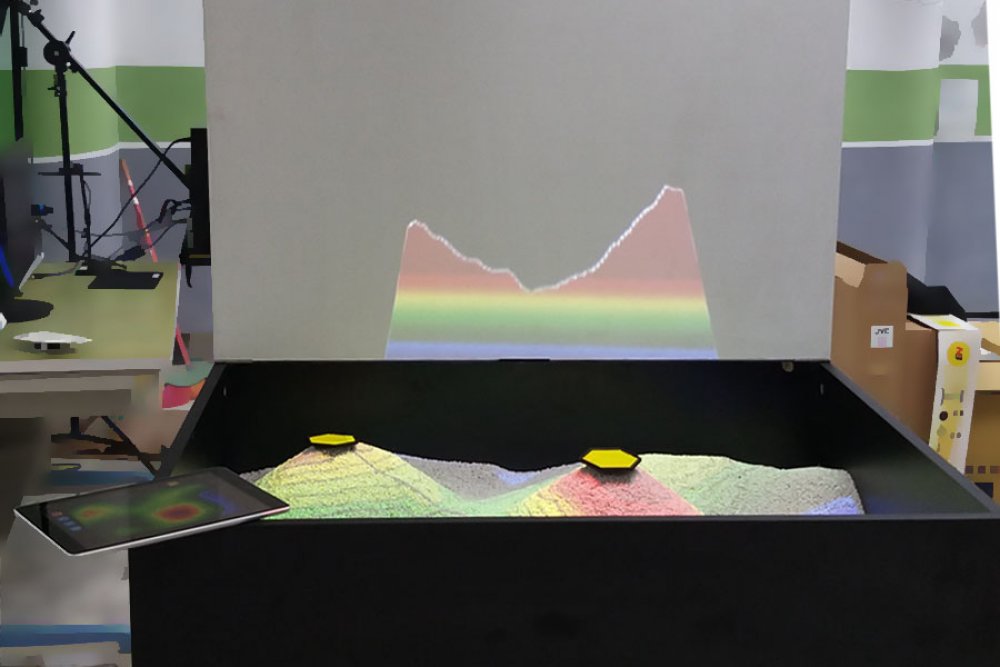 擴增實境地貌互動沙盒透過科技設計,讓我們可以即時看到地勢變化的差異,這些動態的呈現方式輔助空間認知的學習,而不再只是書本平面上的圖片文字的瀏覽。玩中學、學中玩,實際用雙手堆疊真實的沙子,不管是模擬不同地形造成的水文變化,又或是在不同地勢看到的地形剖面樣態,都能透過投影效果一一呈現出來,就連等高線也能看到首曲線和計曲線的粗細之分。不管是教育學習應用或是藝術科技展示,都可以讓使用者耳目一新,同時激發視覺與觸覺饗宴的第一人稱體驗。