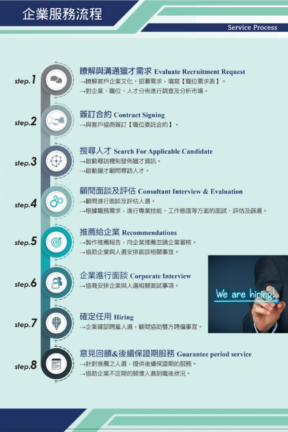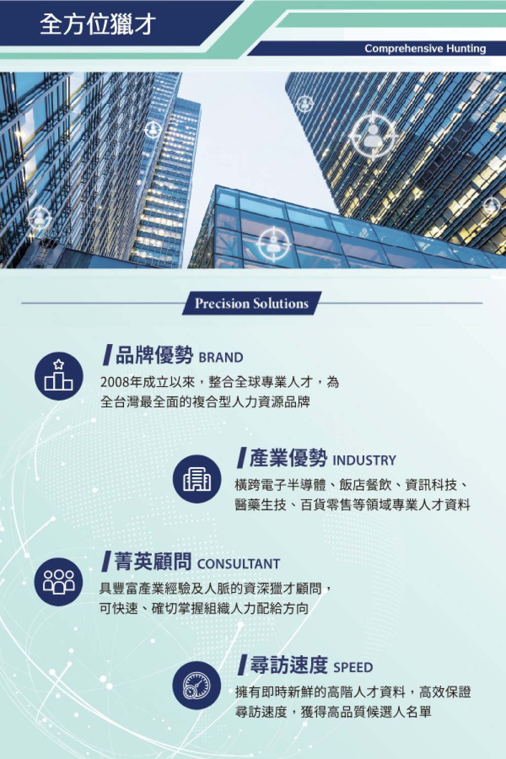 【企業菁英獵才】企業中高階主管、核心幕僚、專業技術人員、儲備幹部人才搜尋,提供精準獵才與目標人選的招募服務。