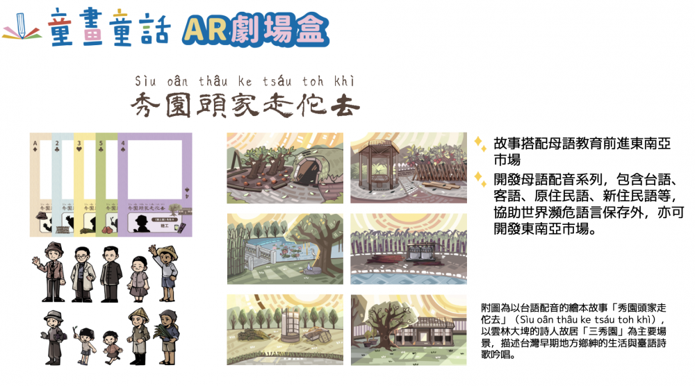 台語奇幻寶盒以雲林三秀園雅集文化協會為背景,以「秀園頭家走佗去」作為故事,開啟了20場的台語說故事的旅行,邀請父母與孩子一同參與互動繪本的體驗,了解三秀園的背景、故事及創立過程,以AR劇場盒方式創造出更多有趣的過程,讓孩童不僅只是說故事跟聽故事的關係,可以透過創造角色使用AR科技,讓兒童的創作可以在故事中呈現,讓孩童透過數位方式與故事有更多的互動性,讓「秀園頭家走佗去」的故事不僅只是讓雲林在地人認識,透過劇場盒方式也可以讓雲林外的人認識。