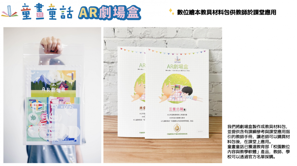 產品內附的材料包採立體紙藝拼圖,讓學童體驗動手實踐的樂趣,互動方式結合AR技術應用,開啟學童數位學習認知,互動內容促使學童創意發想設計角色,啟發藝術美感學習,從多方面帶給學童來自不同領域的基礎認知,培育108課綱中多元學習的能力。