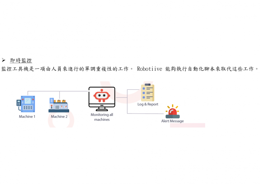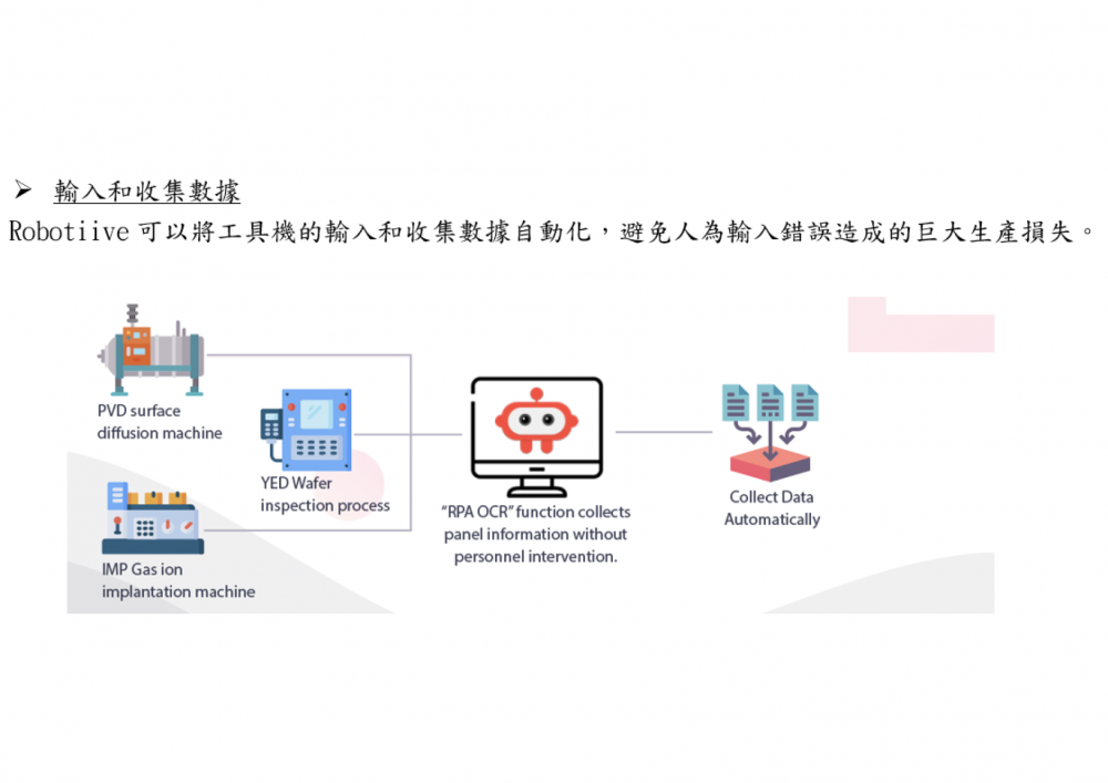 Robotiive 是一款結合了人工智慧和電腦視覺專利技術的流程自動化軟體(RPA),結合了人工智慧和電腦視覺技術,它能夠實現跨平台、跨系統、跨機器的數據整合與自動化。其非侵入式的特性使企業得以輕鬆連接和自動化原本孤立的機器和系統,進而順暢地實現數位化轉型。
