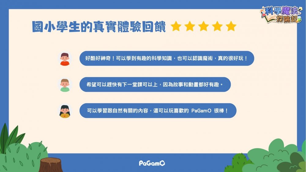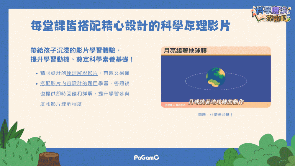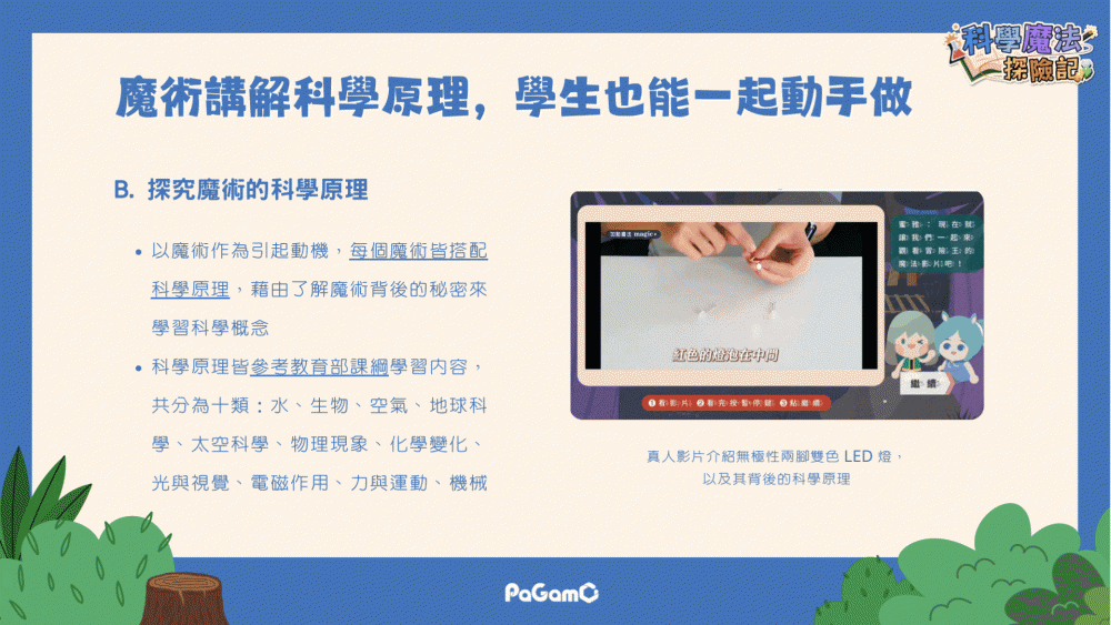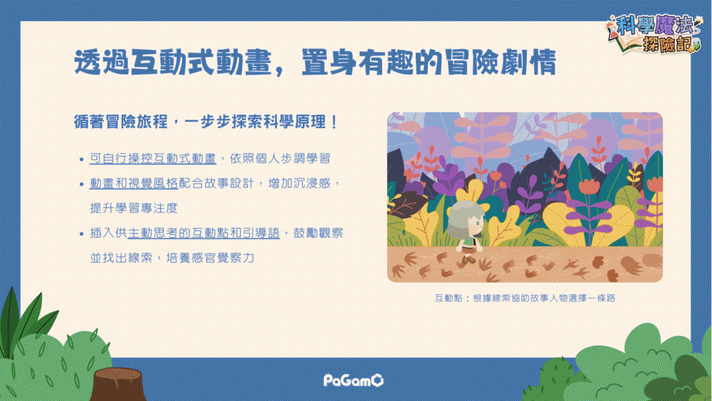 「PaGamO 科學魔法探險記」由一段冒險故事串聯所有精彩章節,適合國小三年級至五年級的學生奠定科學素養基礎。有別於一般的線上教學內容僅是單向輸出,「PaGamO 科學魔法探險記」的全篇內容由精緻的互動式動畫組成,供學生依照所學做出判斷,並且按自身節奏吸收內容,獲得置身探險情境的沉浸式體驗。
