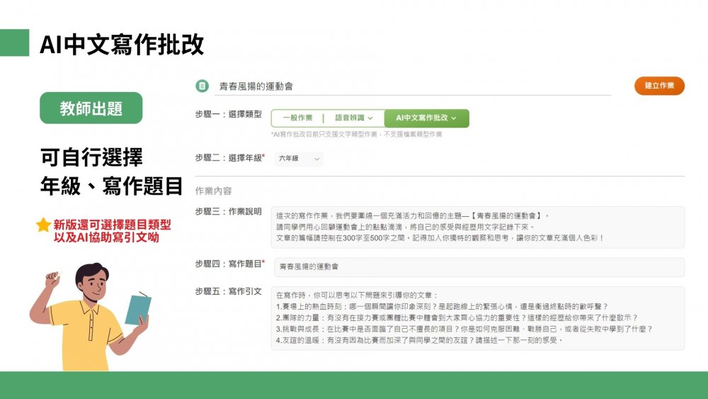 運用學習吧平臺教師指派作業及收繳作業的功能,讓老師能自由選擇出題類型(如:小日記、讀書心得、作文),並由學生自行上傳作文,透過AI大數據的運算,來初步批改、評價文章,給予各式不同類型的作文評分、評語與回饋。