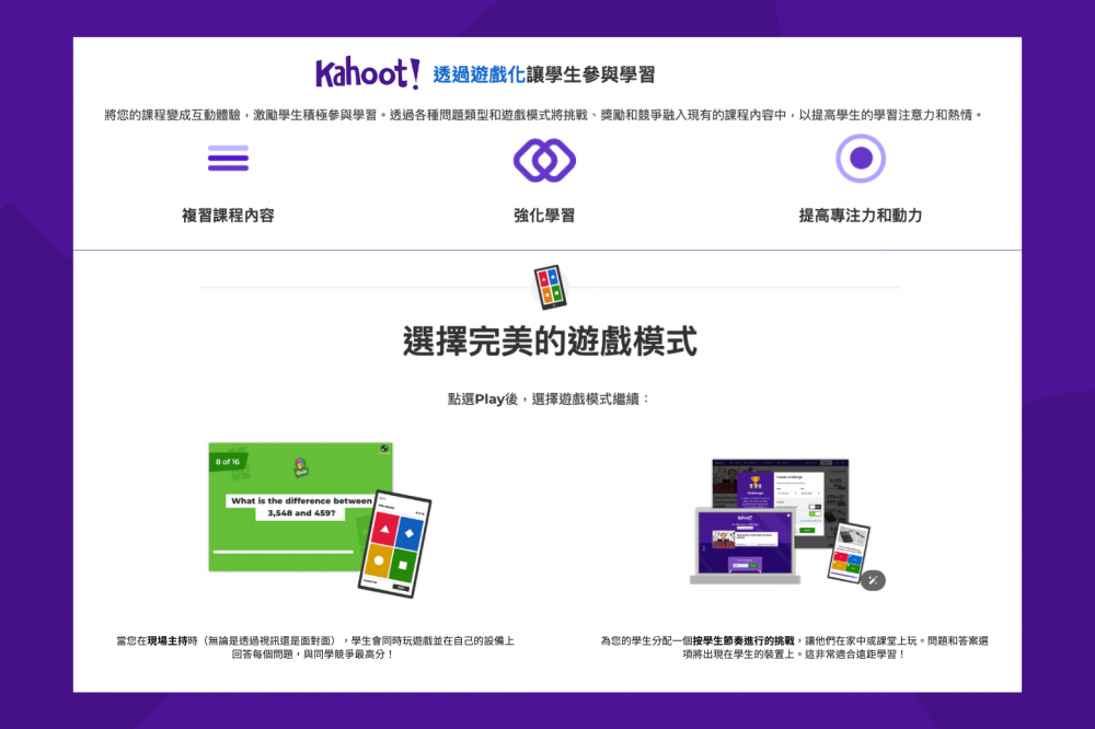 Kahoot! 是一個基於遊戲概念的學習平臺,每天全球有數百萬人在使用 Kahoot! 來找尋、創建、啟動和分享學習遊戲,在 Kahoot! 的公開圖書館中,您可以搜索超過一億個 Kahoot! 游戲,其中包括來自 Kahoot! 學院的高階內容,並可為您的課堂調整使用。