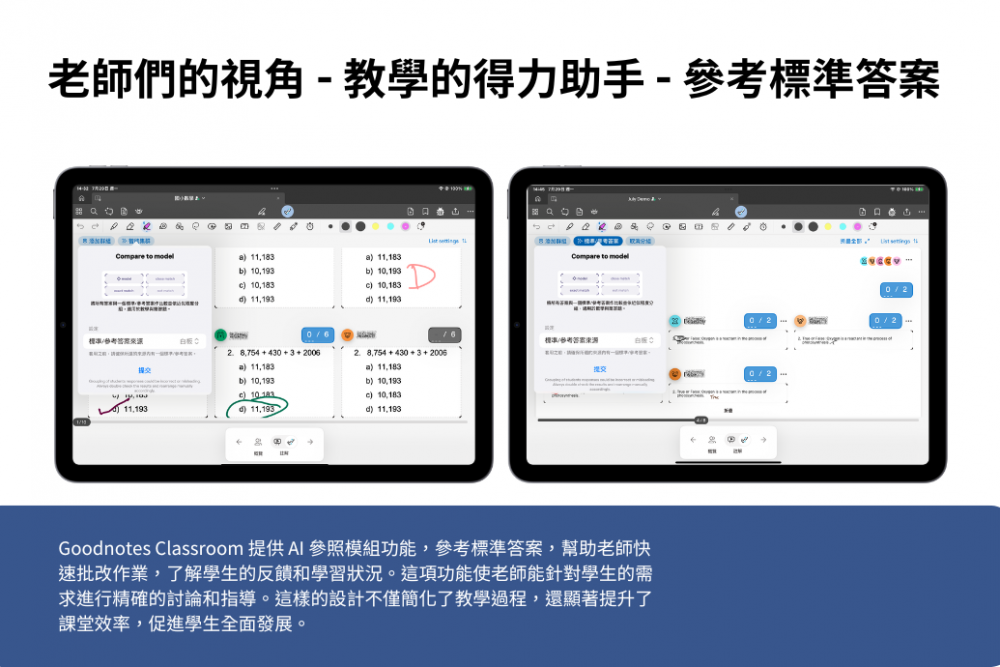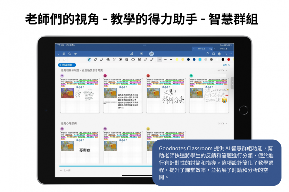 教師透過 Goodnotes Classroom 讓每位學生的創作都能被全班觀摩和討論,學生發揮創意用筆記不同類型的筆、各種顏色、膠帶等各式工具進行藝術創作,教師將授課教材放入筆記中,即時呈現自己的筆記內容,更可以在大屏中切換學生的畫面進行討論,教師更透過 AI 批改分群功能,幫助教師可以直觀看到完全吻合、部分吻合以及完全不符的學生答案群組,並給予反饋。