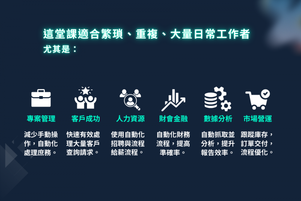 面對層出不窮的 AI 和自動化工具,您的團隊是否也在尋求能真正提升效率的解決方案?想讓 AI 提升效率,ChatGPT 的產出卻不如預期?重複性的電腦文書工作耗費太多時間,沒心力去做更多核心任務?如果您也有以上的困擾,那這堂課可以幫助您用了解 AI 的底層思考邏輯與應用,並探索自動化工具的無限可能。