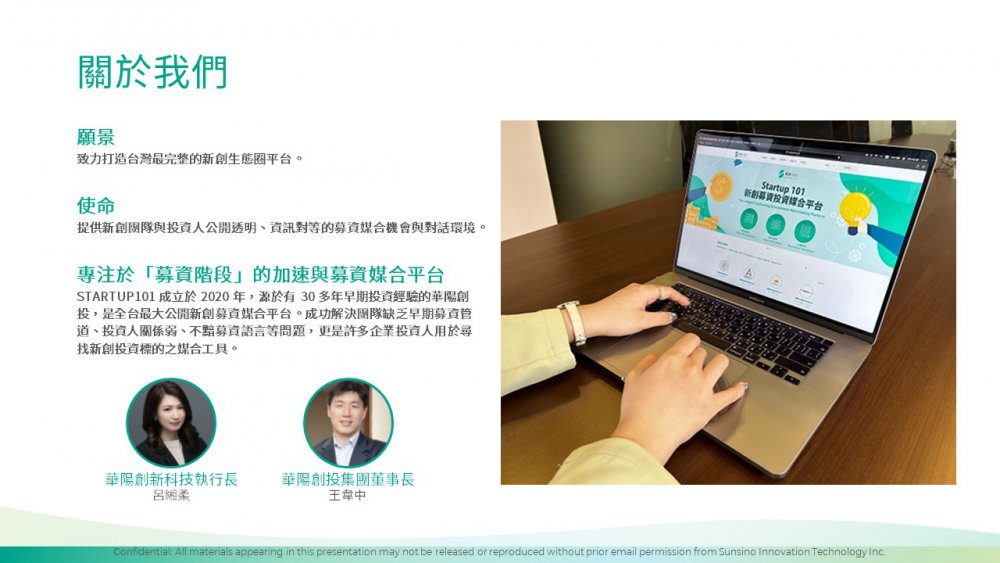 STARTUP101(新創101)係擁有 30 年經驗之華陽創投集團子公司「華陽創新科技股份有限公司」成立之新創募資媒合平台,致力於活絡新創環境、加速資金流動、消弭市場資訊不對稱,同時深入洞察新創市場之趨勢和動態,實現募資者、投資者的雙贏。