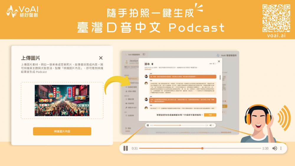 拍照、上傳圖片、輸入文字即可生成雙人對話中文 Podcast,創作活潑多元的教材內容。