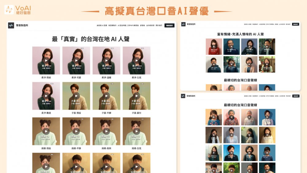 提供超過45位台灣口音高擬真 AI 聲優,讓AI聲音也能富有情緒、充滿人情味,創造台灣在地聲音。線上即可生成如同真人般親切真實的臺味人聲,提供快樂、難過、生氣...等不同的聲音表情,男女老幼、喜怒哀樂,多種個性聲線任你選。