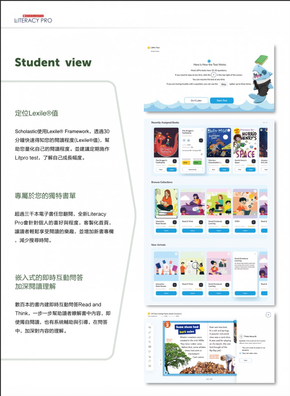 平台內建近三千本優質圖書,多元主題滿足各種學習需求,閱讀後更有即時測驗,幫助學生掌握學習成效,讓老師與家長也能即時掌握進步情況,提供個別化學習建議。完善的系統設計與專業內容,讓學生在豐富、安全的數位環境中,快樂培養英文閱讀習慣,提升綜合語言素養。