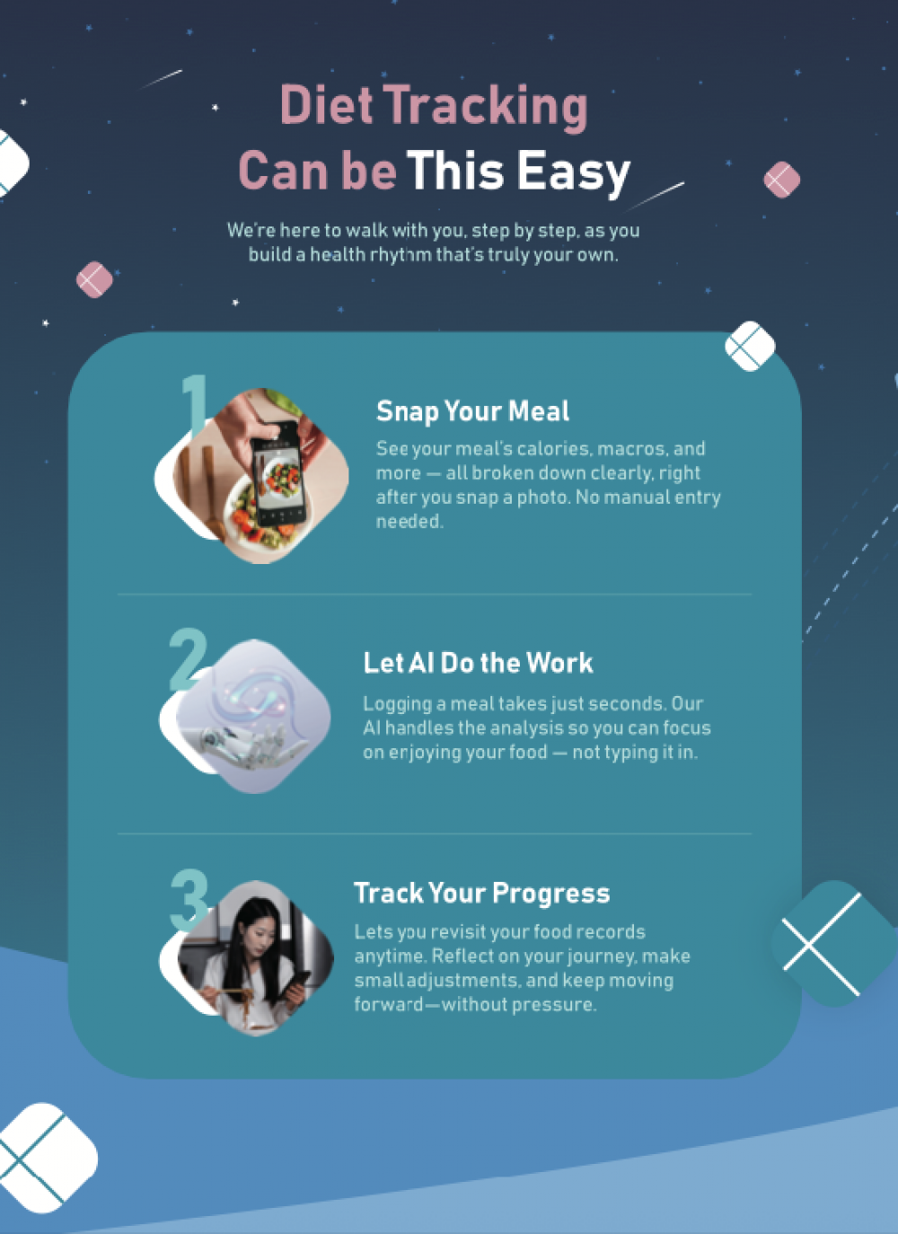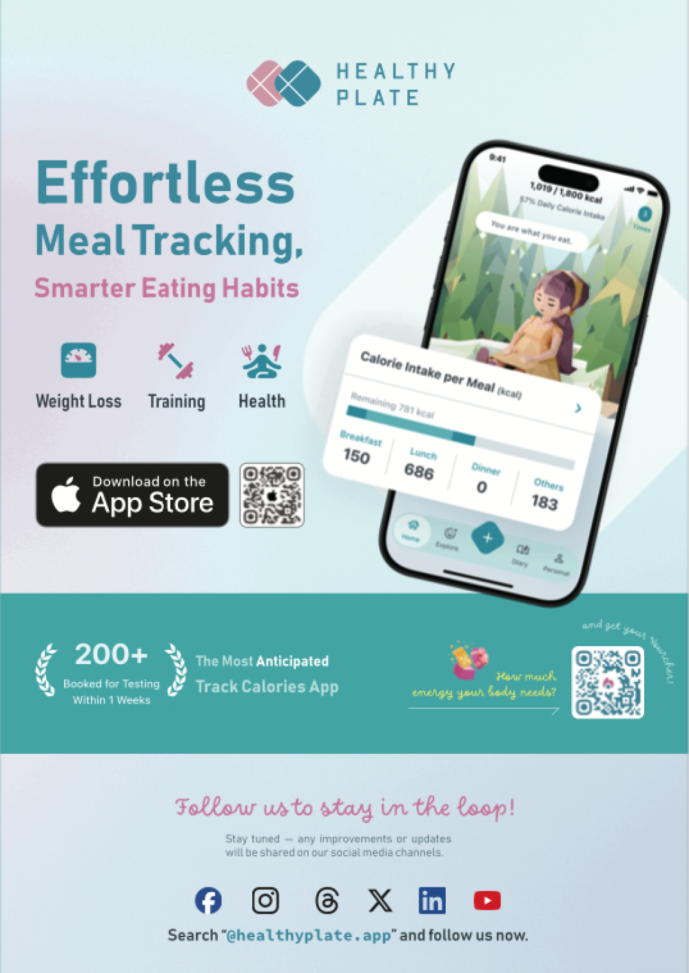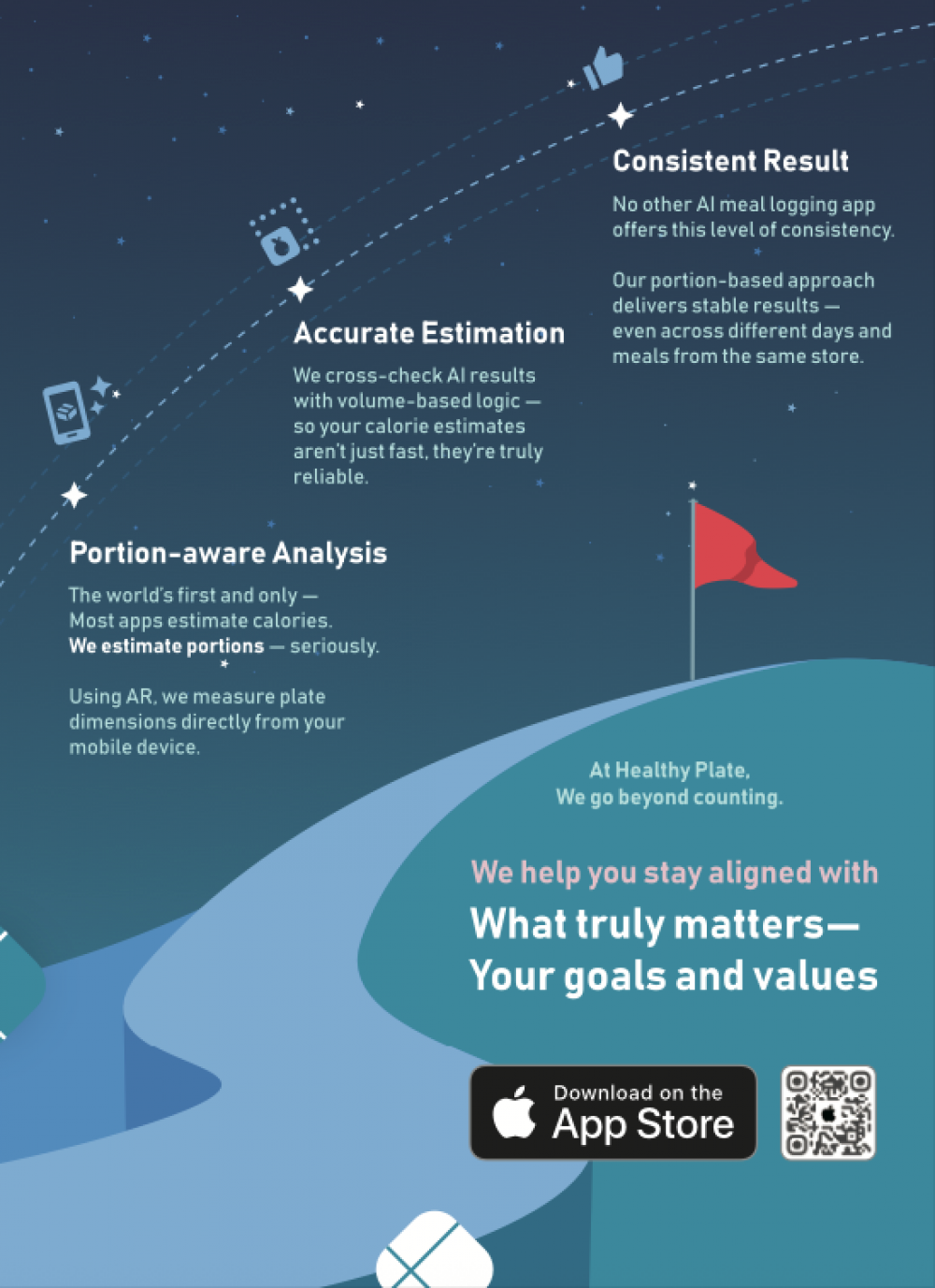 Healthy Plate首創AI影像×AR份量量測的一站式飲食分析平台,10秒內完成熱量與營養計算,從飲食分析出發提供個人化建議,協助用戶建立可持續的健康飲食習慣。