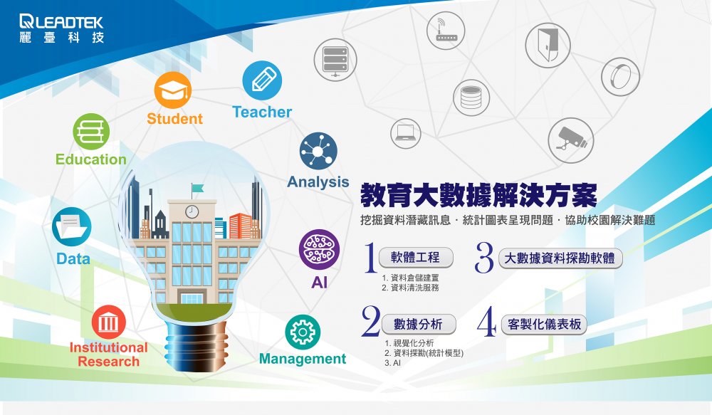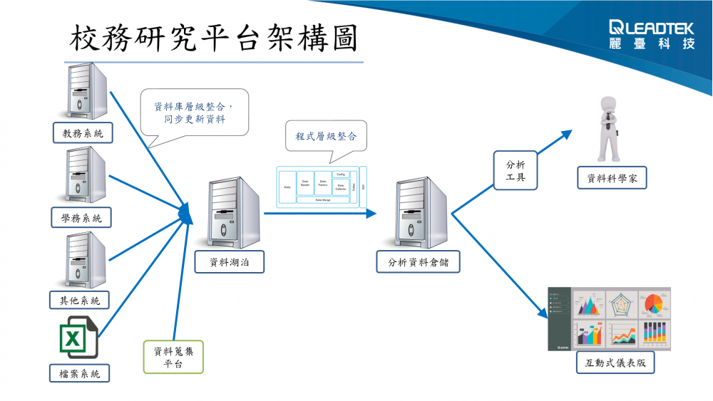 麗臺科技教育大數據解決方案可有系統地整合校內或校外的各式系統,即使是不同檔案格式的資料,皆可匯整成高擴充性的資料倉儲,供分析人員撈取即時且乾淨之資料進行交叉分析,並以即時統計圖表呈現,有效協助使用者挖掘亮點,規劃對策,使決策科學化。