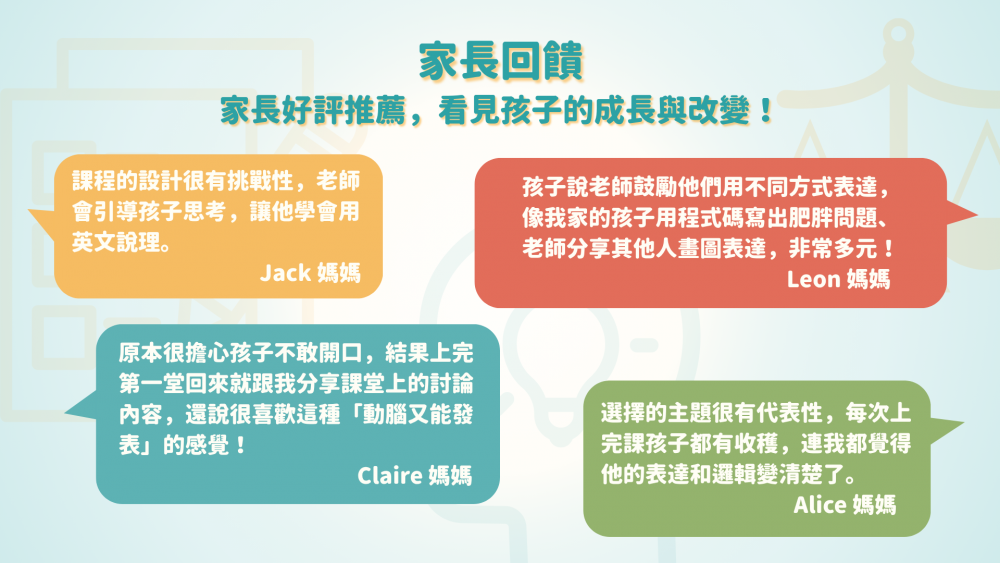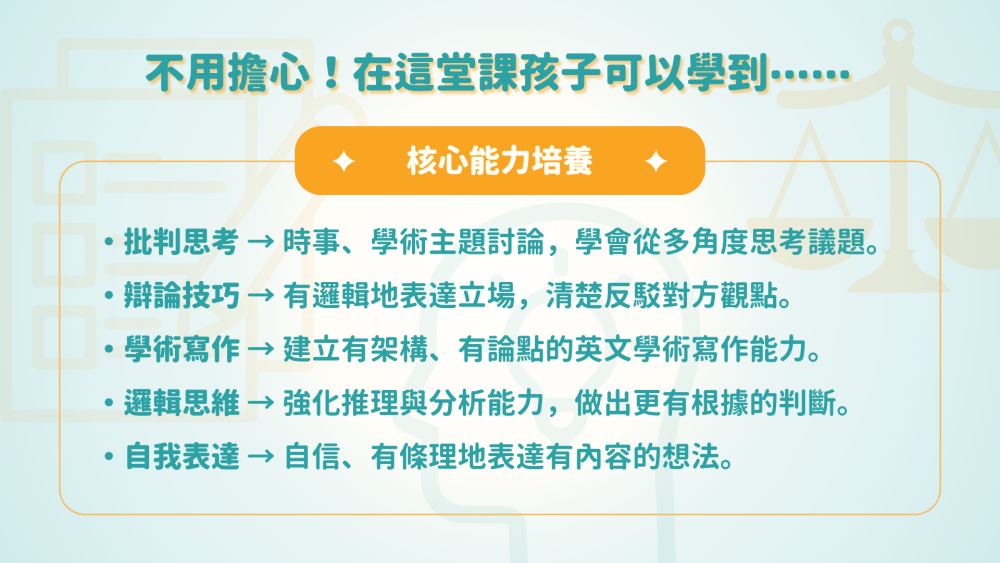 從各大議題的探討與思考碰撞中,孩子能逐步地建構出具有邏輯性的思維模式,並能夠清晰且有說服力地表達自己的觀點。