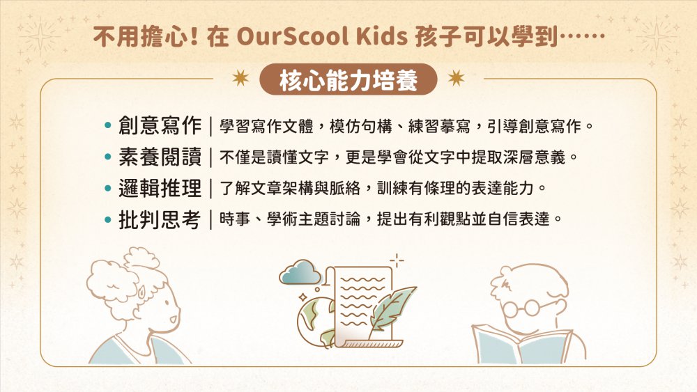 OurScool Kids 相信,「讓孩子主動思考」這樣的課堂會比傳統的授課方式,帶給孩子更多啟發、更多知識,也讓孩子更加自信。