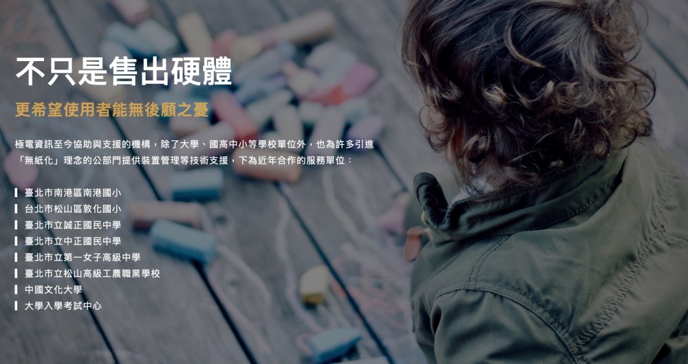 極電資訊至今協助與支援的機構,除了大學、國高中小等學校單位外,也為許多引進「無紙化」理念的公部門提供裝置管理等技術支援,下為近年合作的服務單位: