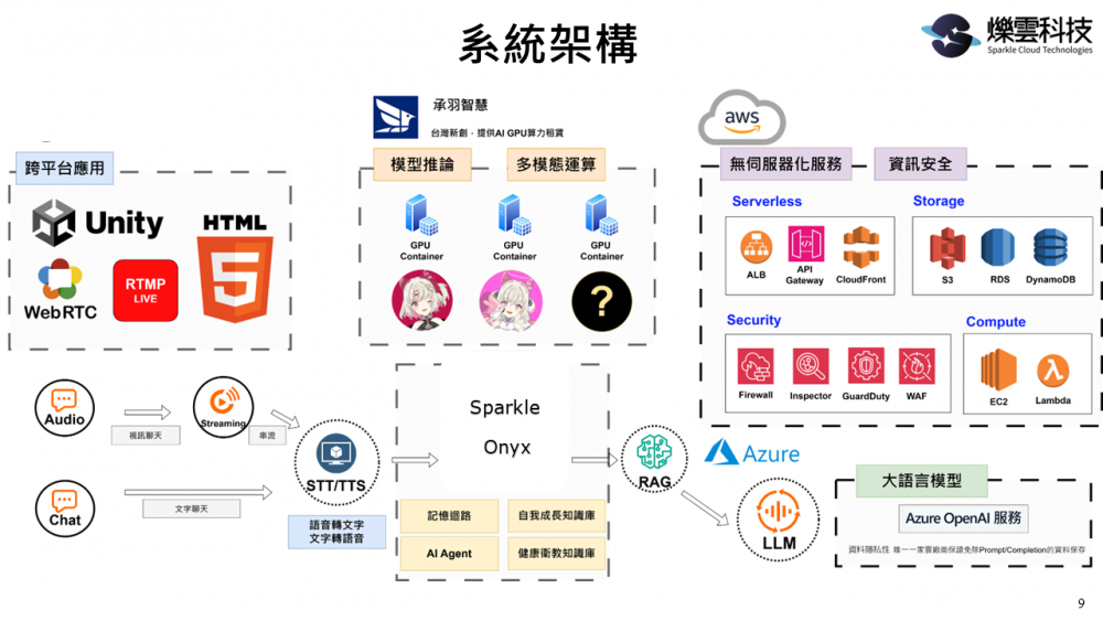 爍雲科技(Sparkle Cloud Technologies)致力於打造溫暖且具情感智慧的虛擬AI角色,推動AI從冷冰冰的工具,成為日常生活中的有感陪伴者。本次展出聚焦「智慧陪伴 × 樂齡共感」,展示我們專為中高齡族群設計的AI陪伴方案-Sparkle Onyx,包括影像識別、語音識別(ASR)、文字生成(LLM)、個人記憶、日常情緒陪伴等功能,透過高擬真自然對話與使用者互動分析,提升樂齡者的生活參與感與數位自信。