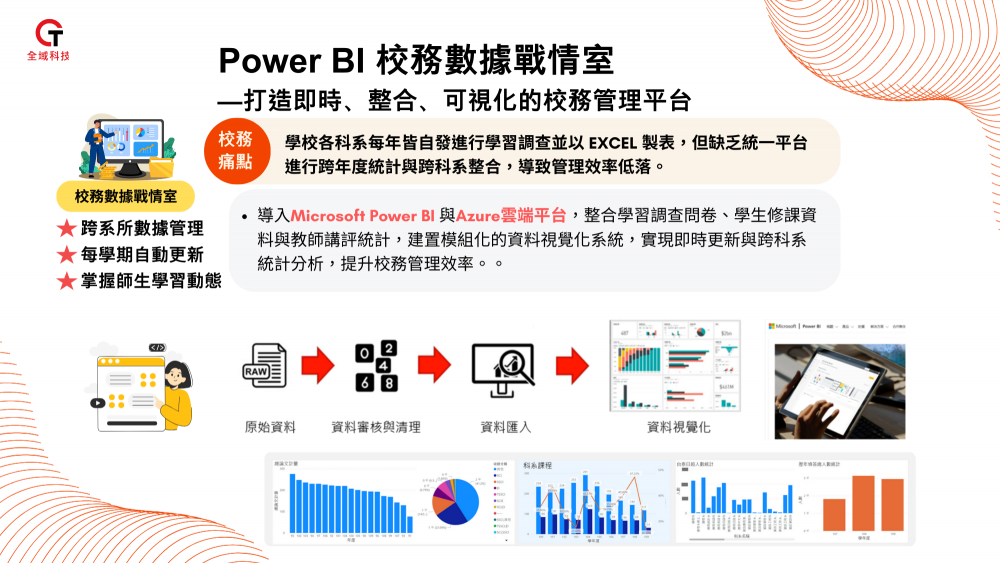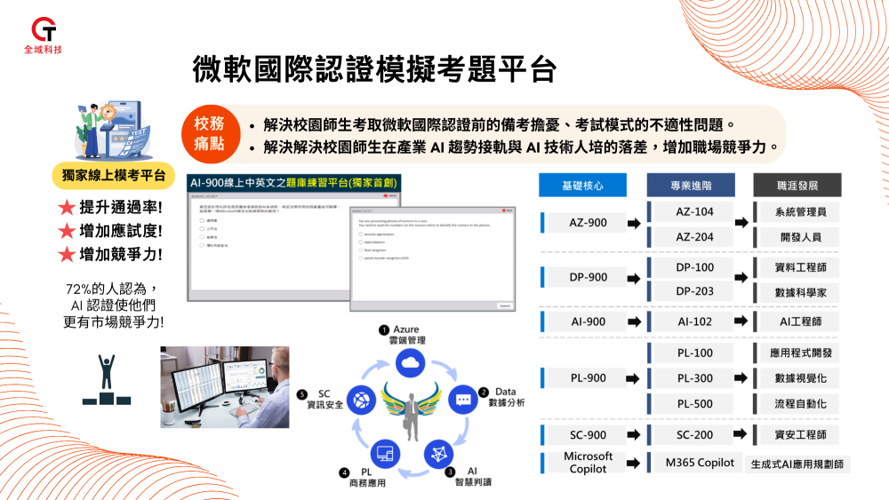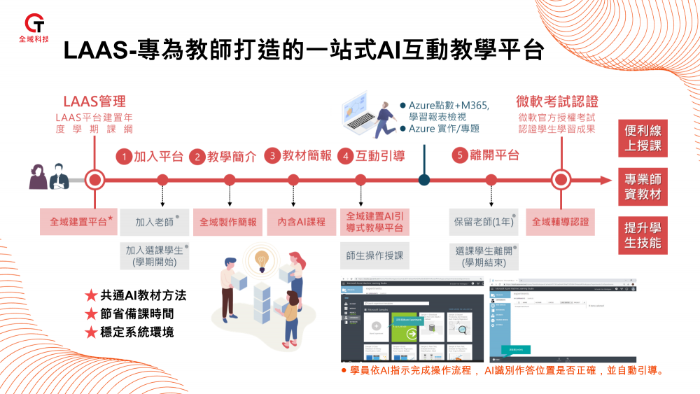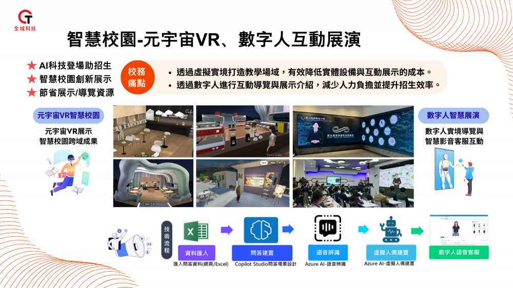 針對校園行政與教職員教學各式不同需求,提供校園多種一站式服務:包括協助優化日常行政工作的「智慧辦公 AI 助理」、提升決策效率的「校務數據戰情室」、促進AI互動學習的「LAAS 教學平台」、打造沉浸式場域體驗的「元宇宙 VR 智慧校園與數字人展演」,以及強化AI專業力的「AI 國際認證與模考平台」。可依照學校需求彈性選用,協助各級學校全面邁向智慧教育新階段。