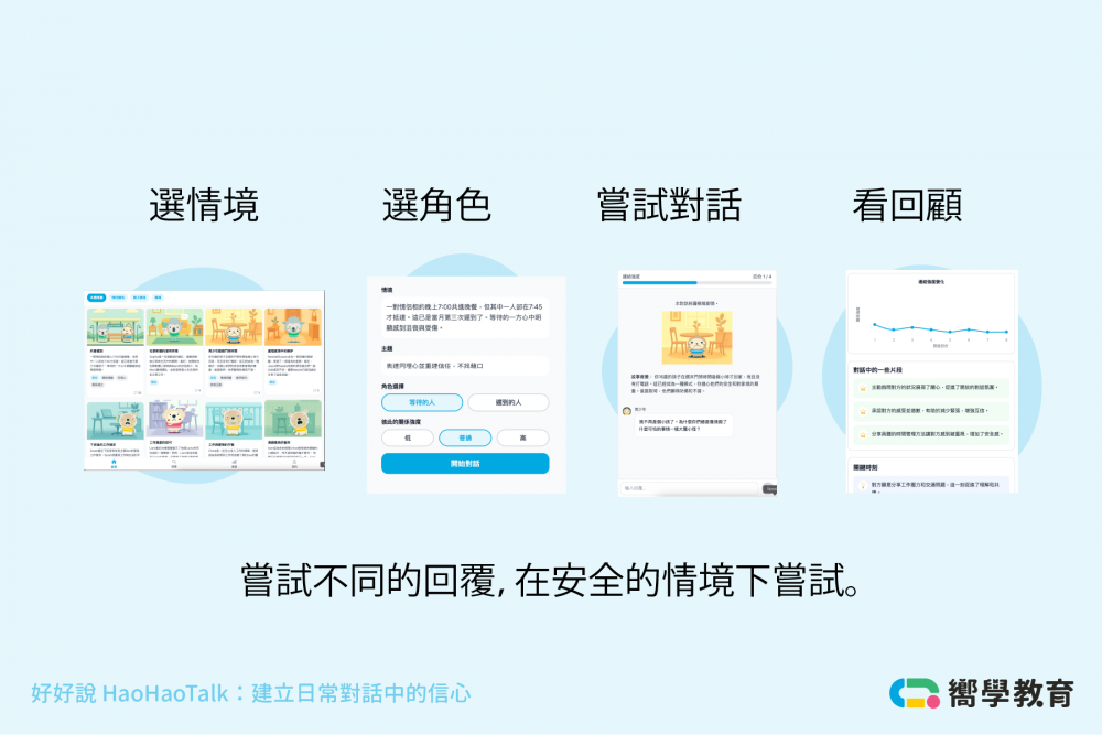 從選擇情境、扮演角色、設定關係強度開始,你可以反覆練習一段對話的每個細節。透過即時回饋與個人化建議,逐步建立自己的溝通信心。