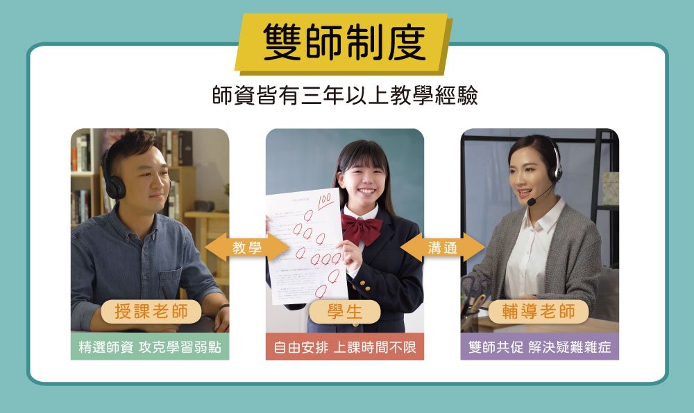 【雙師制度】3年以上教學經驗的授課教師一對一適性教學,優質輔導老師伴學解答疑問