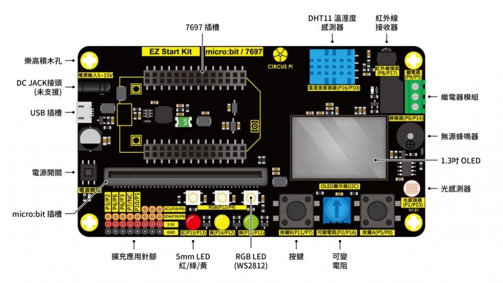 ‧按鍵A&B:直徑約6.5mm的黑色圓形小按鈕,這兩顆按鈕能讓您輸入指令並控制擴展板。