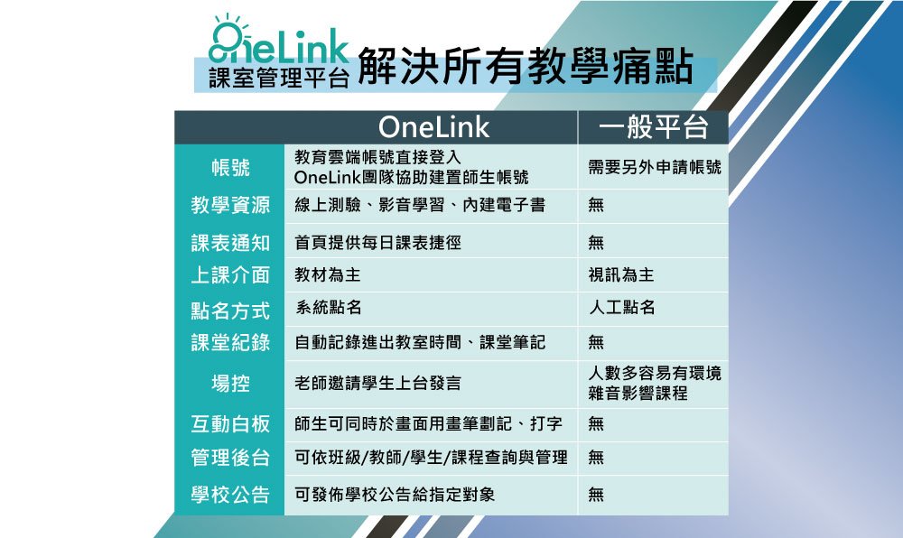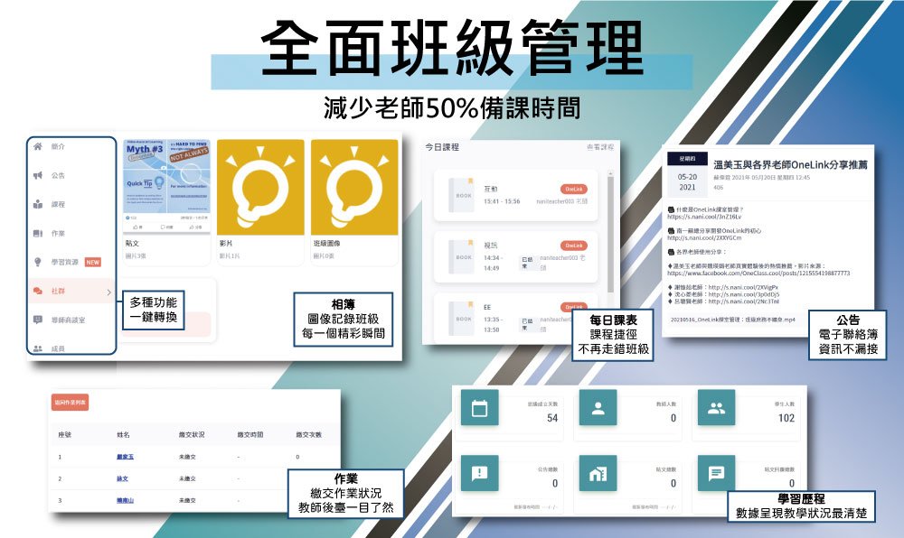 OneLink是針對班級經營特別開發設計的課室管理平台,除了班級管理必備的即時訊息發布、課堂活動討論、派發繳交作業,更強大的是整合所有教學資源,電子書、影音、派卷出題,讓老師遠距教學輕鬆上手,備課時間減少50%以上。