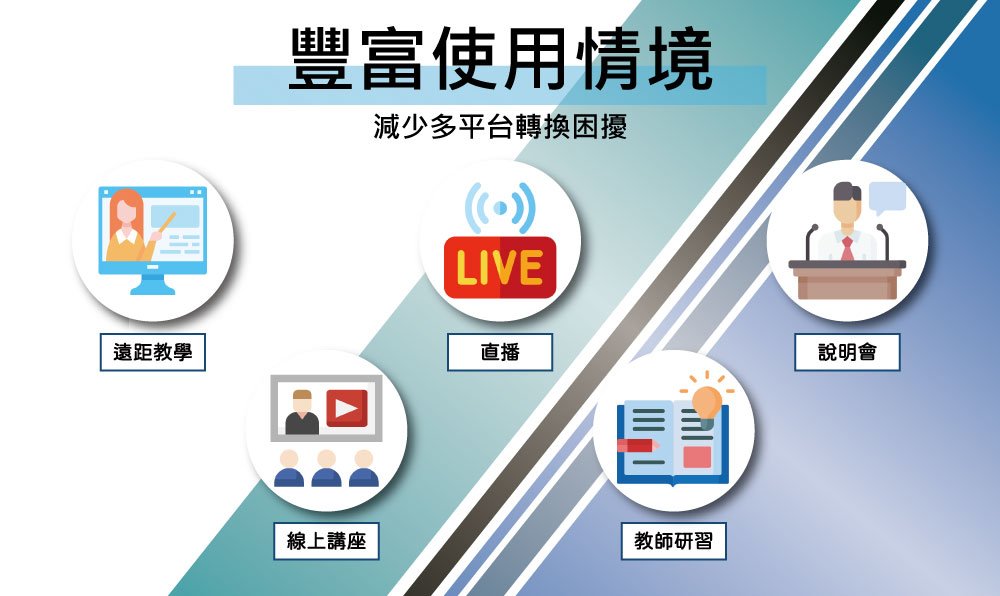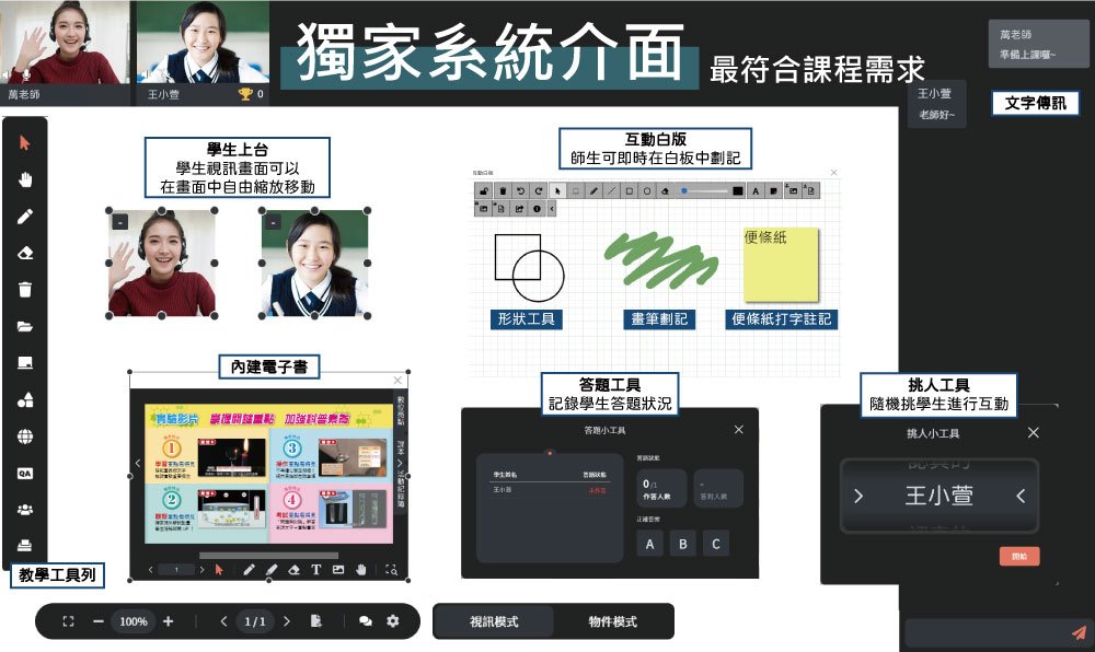內建視訊互動功能及齊全的教學工具,也是最符合教學習慣的遠距上課系統。師生白板劃記功能、即時文字傳訊、點選學生上台、課堂自動紀錄功能。減少教師多平台間轉換的困擾,打造最符合教學需求的一站式服務。