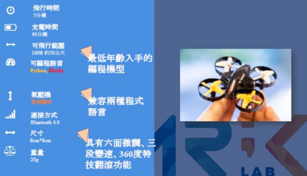 我們將無人機技術本位內容轉化為教學的知識系統,已研發眾多教學方案以及教材套件,推廣足跡遍及台灣、上海、廣州至新加坡等國家,利用小專題方式學習、深化知識,讓學生們不只學知識、而是各領域善用知識,進而提升溝通組織能力,研究能力,問題思考與解決能力及美感設計學習等軟實力,以實現綜合學習樂趣。配合無人載具,創造機會教育,讓日常生活裡不論在家或公園都能使用我們的無人機去發現有趣的學習環境。