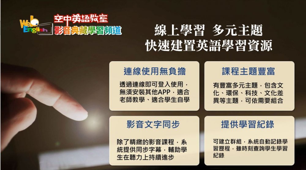 《WebEnglish空中英語教室主題頻道》提供空中英語教室精選主題課程,包含商業職場、劇情小說、旅遊探險、健康樂活、生活百科、運動賽事、節日慶典、科技新知、名人小傳及休閒娛樂等主題,能夠快速建置校園英語教材庫。